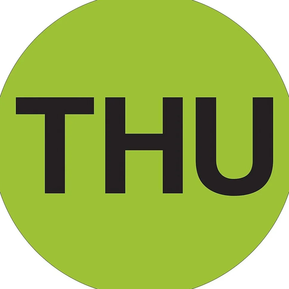 Tape Logicâ„¢ 1″ “THU” Days of the week label in fluorescent green color is printed with black color text. Label in circular shape has pressure sensitive adhesive for quick attachment on any surface, sold as 500 per roll.