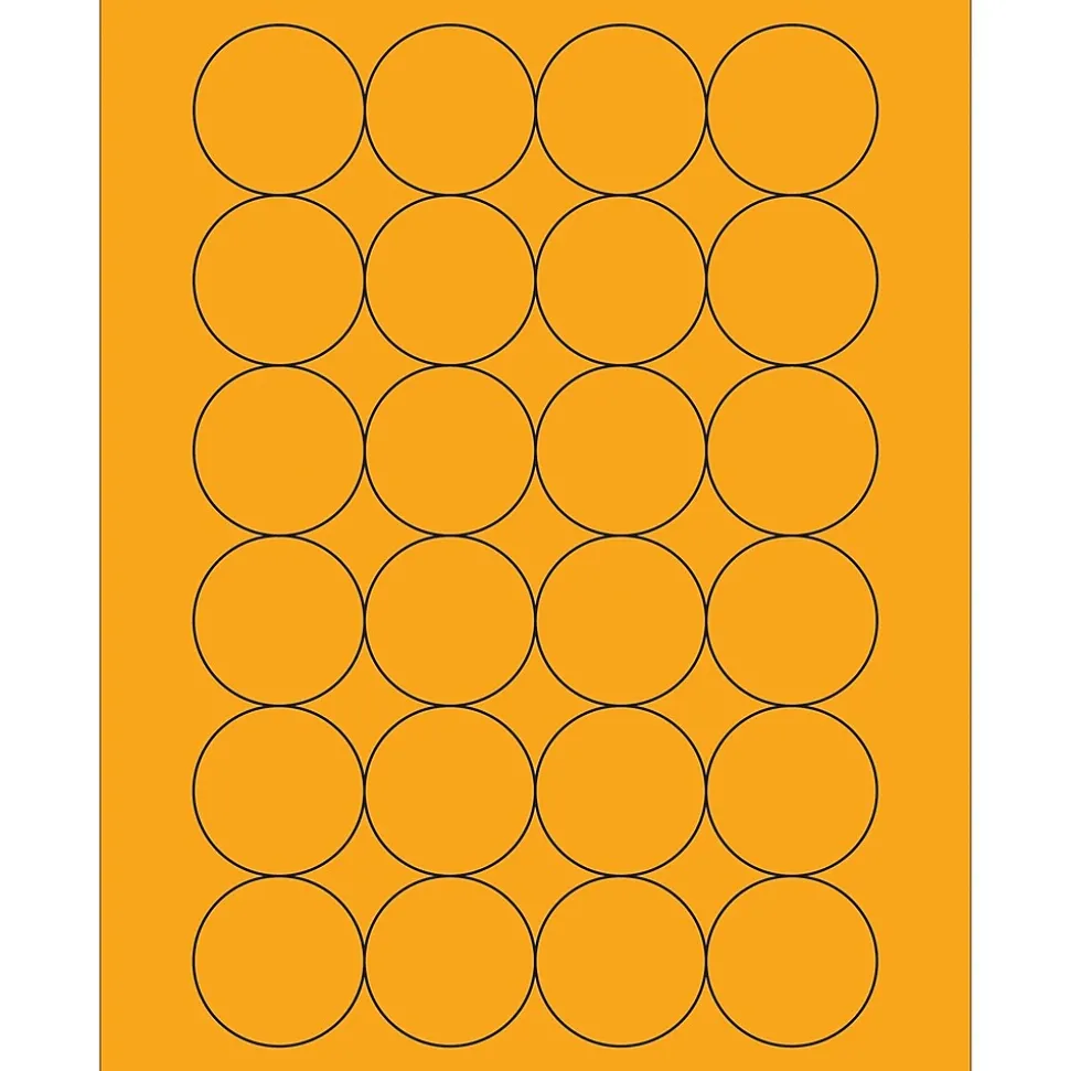 1 2/3″ Fluorescent Orange Circle Laser Labels. Use to create your own product or mailing labels. Labels work with both laser and ink jet printers. Permanent adhesive. Labels stick to a variety of smooth surfaces including paper, corrugated, plastic, wood, glass and metal.