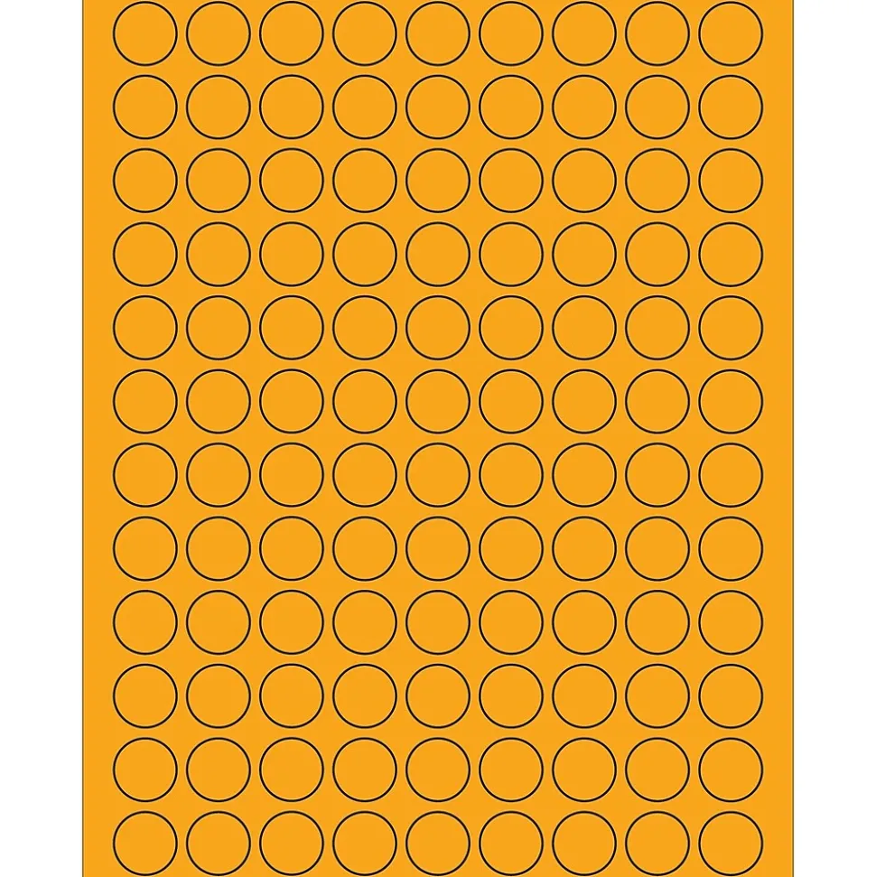 3/4″ Fluorescent Orange Circle Laser Labels. Use to create your own product or mailing labels. Labels work with both laser and ink jet printers. Permanent adhesive. Labels stick to a variety of smooth surfaces including paper, corrugated, plastic, wood, glass and metal.