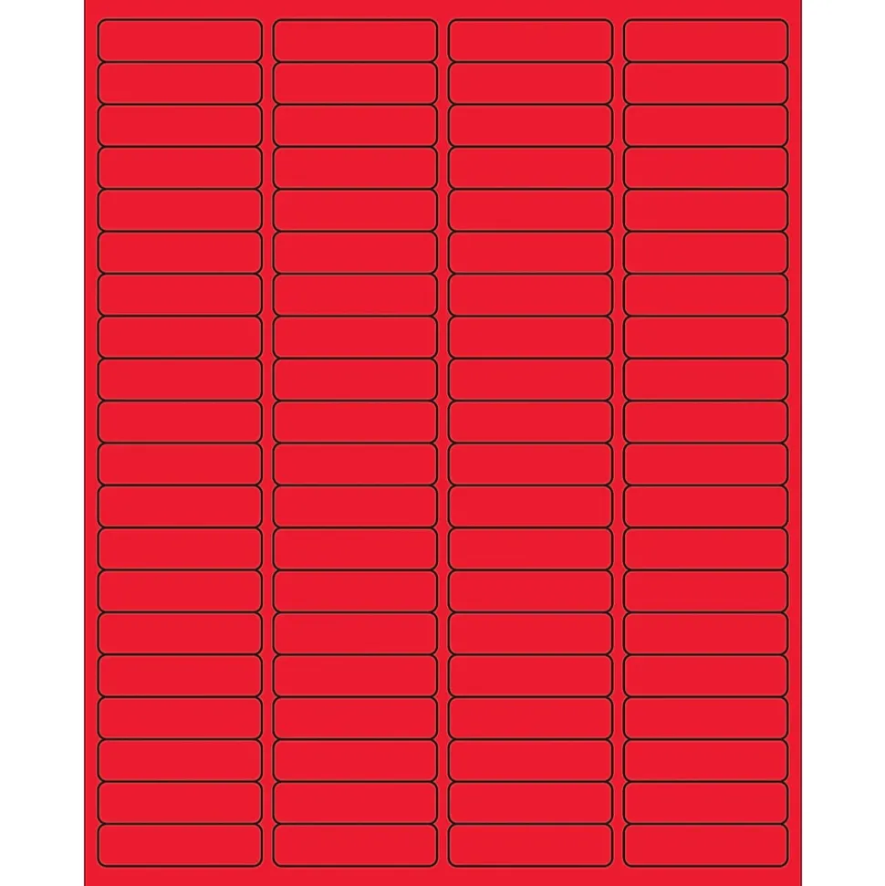 1 15/16 x 1/2″ Fluorescent Red Rectangle Laser Labels. Use to create your own product or mailing labels. Labels work with both laser and ink jet printers. Permanent adhesive. Labels stick to a variety of smooth surfaces including paper, corrugated, plastic, wood, glass and metal.