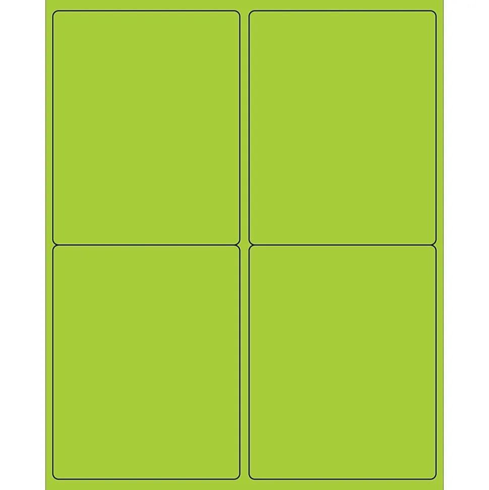 4″ x 5″ Fluorescent Green Rectangle Laser Labels. Use to create your own product or mailing labels. Labels work with both Laser and ink jet printers. Permanent adhesive. Labels stick to a variety of smooth surfaces including paper, corrugated, plastic, wood, glass and metal.