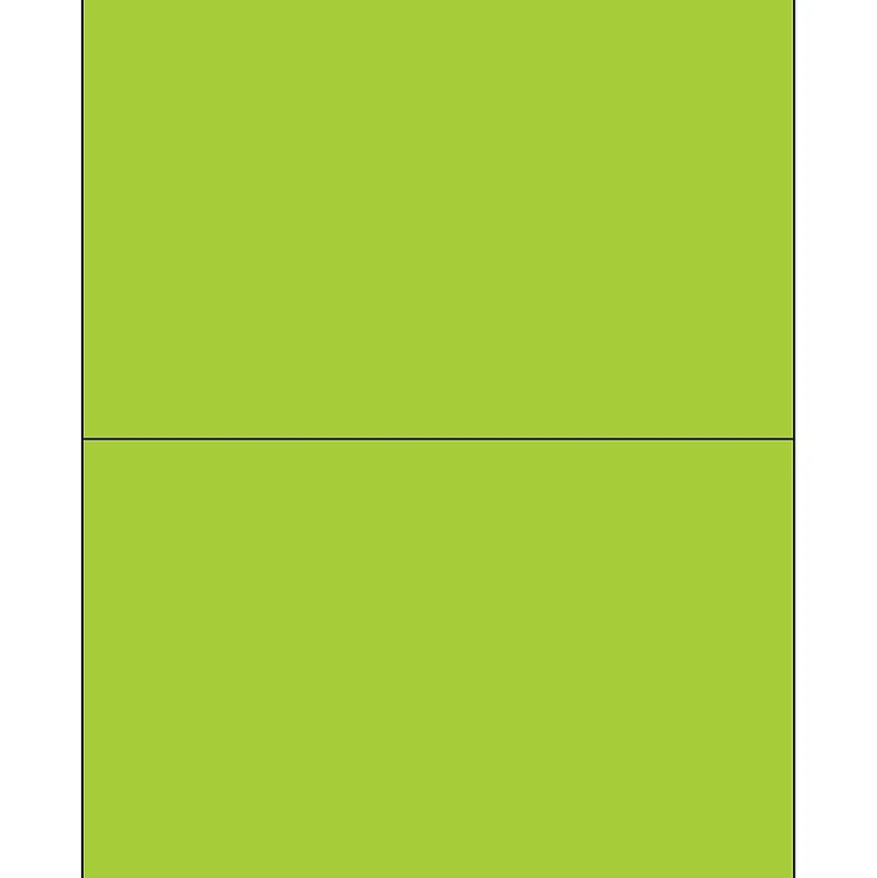 8 1/2″ x 5 1/2″ Fluorescent Green Rectangle Laser Labels. Use to create your own product or mailing labels. Labels work with both Laser and ink jet printers. Permanent adhesive. Labels stick to a variety of smooth surfaces including paper, corrugated, plastic, wood, glass and metal.