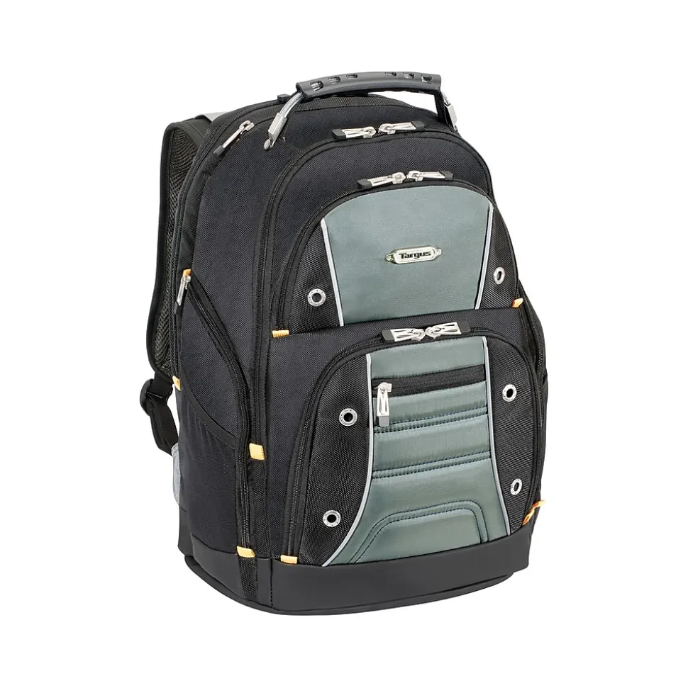 The Targus Drifter II laptop backpack is designed to fit laptops with screens up to 17″. This backpack features two large compartments for storage, including a padded laptop compartment that keeps the device secure and separate from other items carried in the case. The extremely thick padding on the back panel includes a large hidden zippered compartment and is strategically placed to provide lumbar support for your back. The heavily padded shoulder straps provide comfort for travel and include a removable mobile phone pocket as well as an elastic loop specifically designed to hold sunglasses on the shoulder strap. The main front compartment includes pockets for business cards, a mesh accessory pocket, and key clip. A convenient and soft lined pocket is scratch-resistant to store fragile accessories, such as glasses, and more. To keep files in order, the interior divider provides a safe place to store documents. Focusing on durability, the Drifter II backpack features a weather-resistant bottom, thick industrial zipper pulls, and a sturdy molded plastic handle supported by metal grommets and cabling. The backpack offers a rugged case full of storage options and protective compartments for important devices.