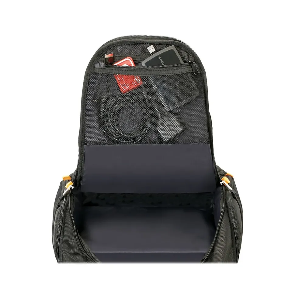 - Main front compartment includes pockets for business cards, a mesh accessory pocket, and a key clip