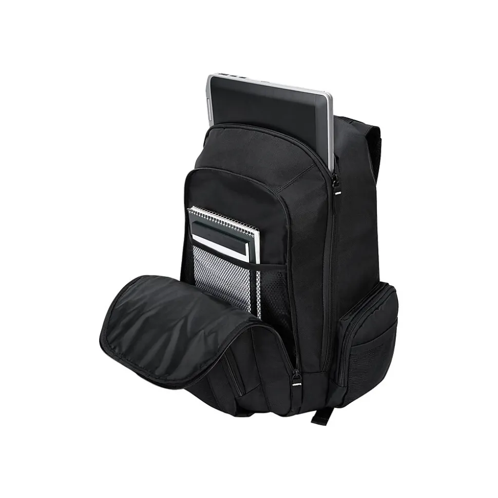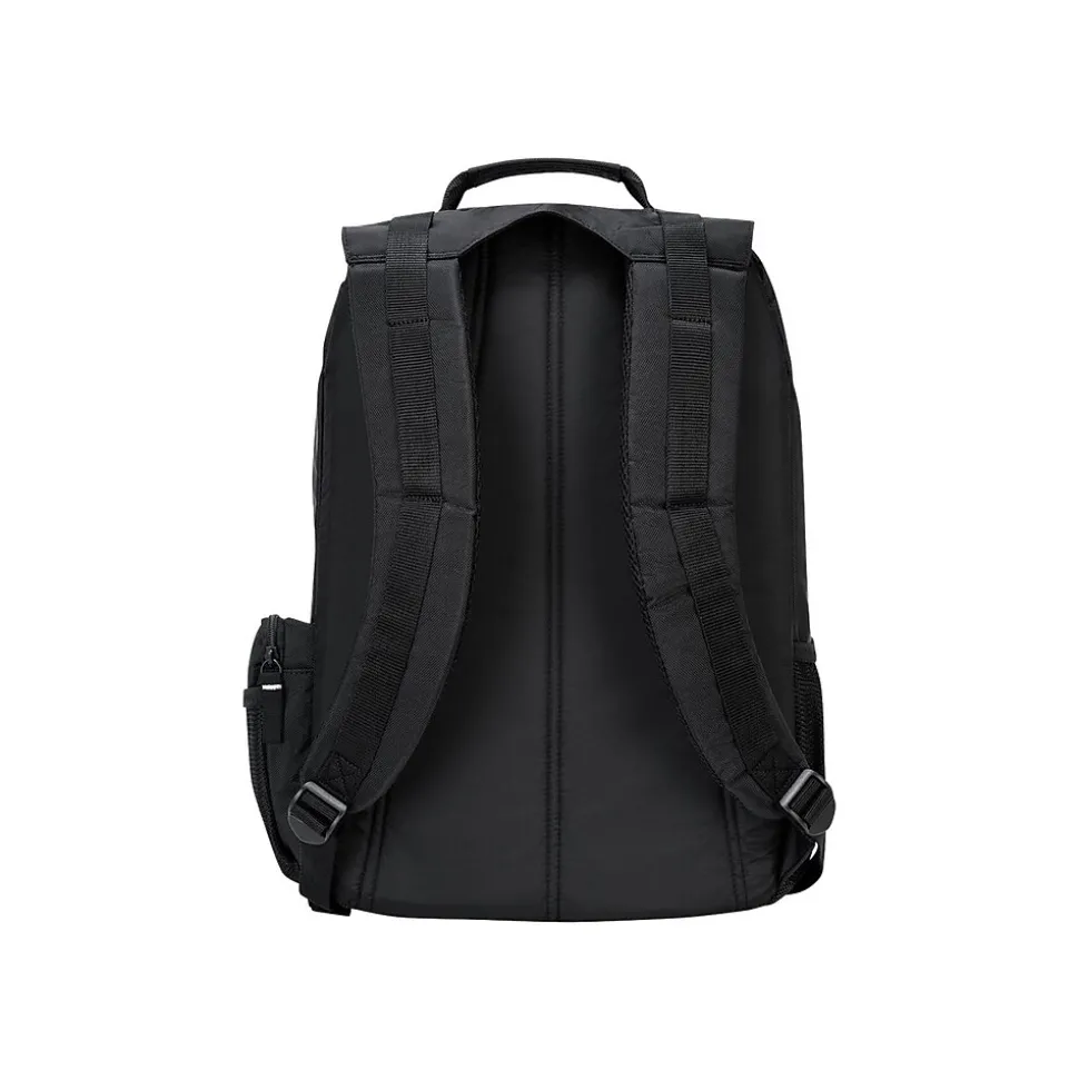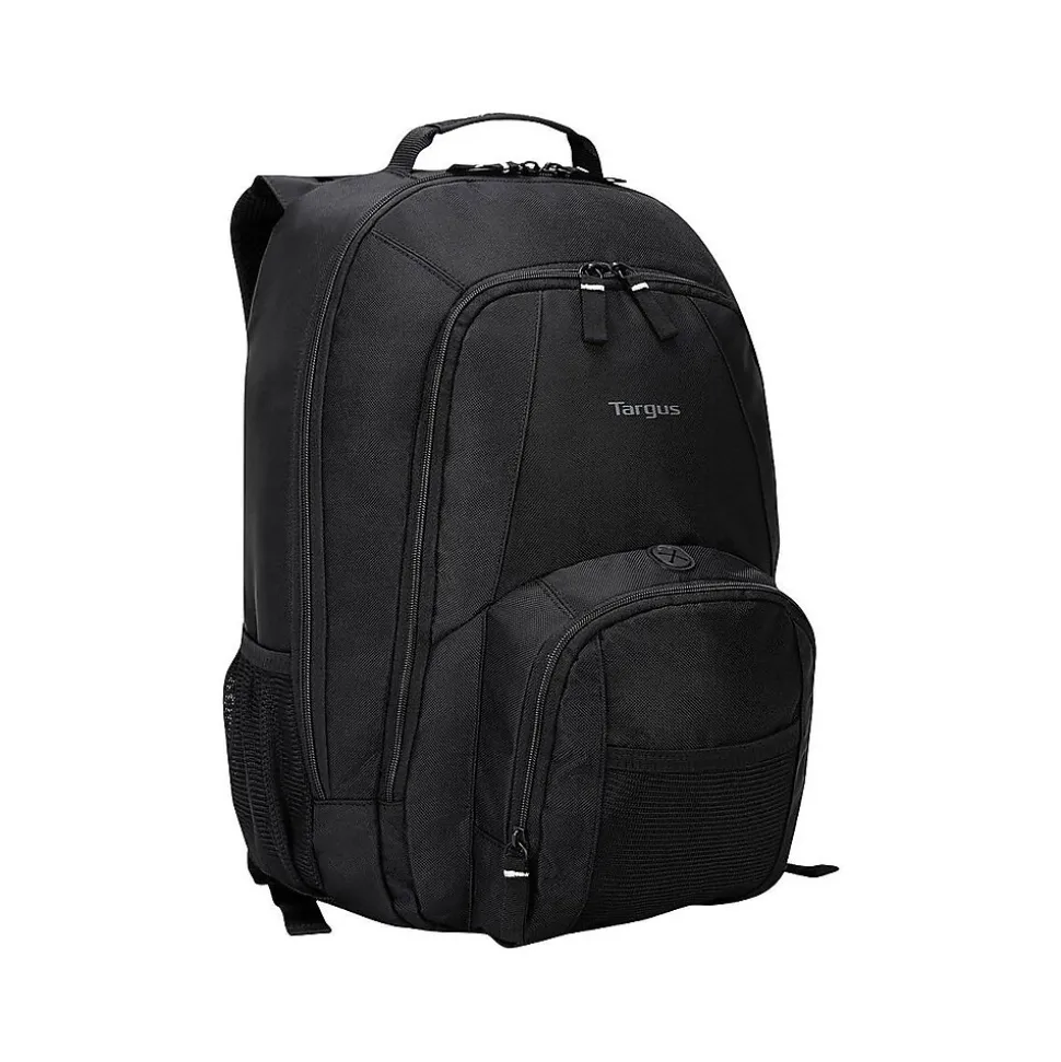Keep files, assignments and other papers organized with this black backpack. The water bottle holder is conveniently accessible, making it easy to stay hydrated throughout the day, while the mobile phone pouch keeps devices protected and within reach. Featuring a foam padded 16-inch pocket, this backpack is ideal for keeping laptops protected. A front storage area keeps CDs, pens and other items secure thanks to its padded design, while the bottom of this backpack is made from durable PVC material, protecting contents from water damage. This Targus Groove backpack features multiple compartments, making it easy to contain everything you need during the day.