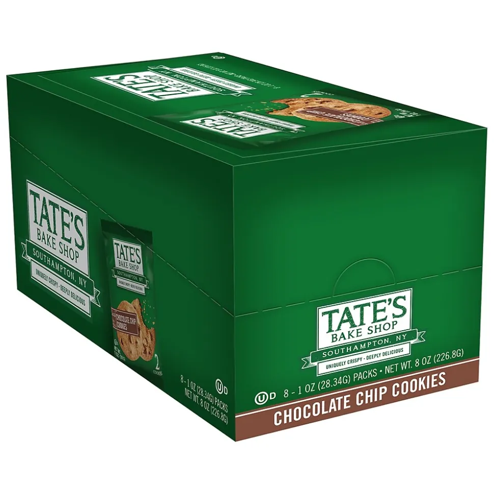 The Tate’s Bake Shop signature thin crispy and buttery chocolate chip cookies are available in single-serve two-count packages and make the perfect anytime snack! Tuck a package of these two-count cookies into a lunch box, beach bag, or briefcase for a great on-the-go snack. Contains two boxes of eight two-count packages, for a total of sixteen individual packages of two-count cookies.
