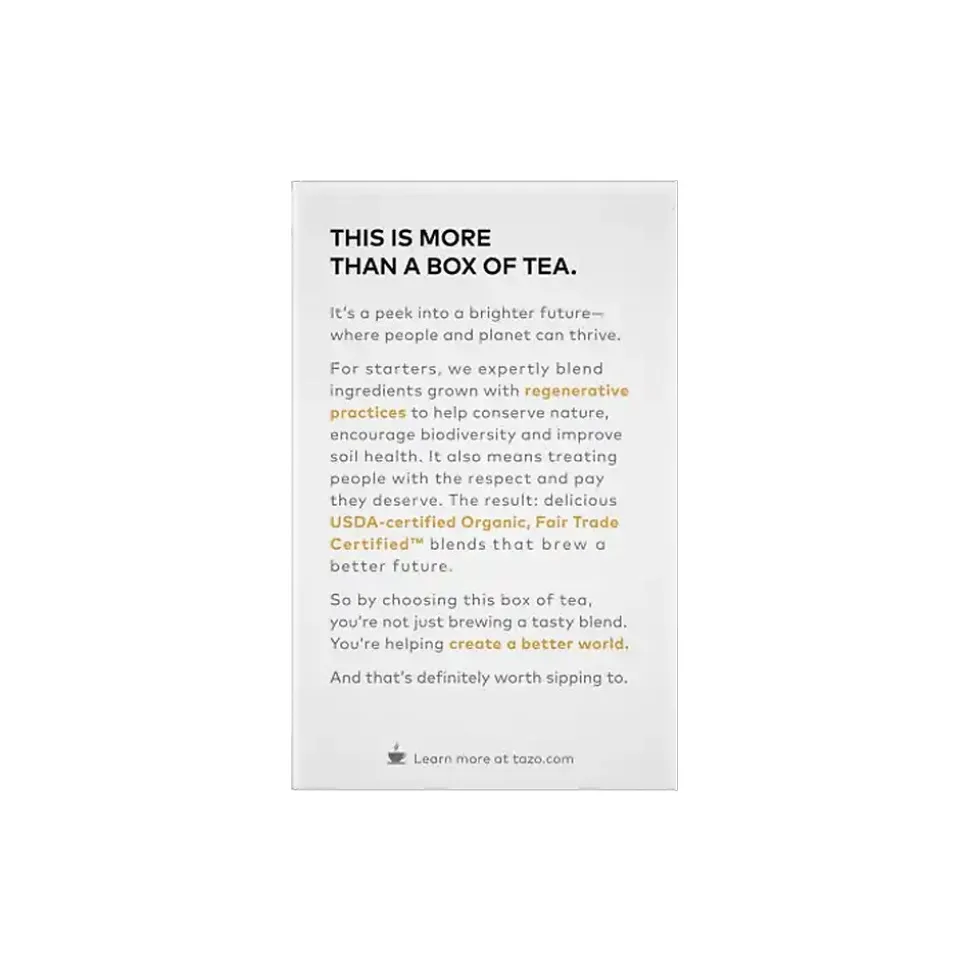 Say later to boring teas with the Tazo regenerative chai tea. With rich, bold notes of cinnamon, cardamom, ginger, and black pepper, this flavor-packed tea blend will leave your taste buds singing. And because it’s made from Fair Trade Certified ingredients grown with regenerative agriculture practices, it’s better for the people who grow it and the land where it’s grown. A great-tasting tea that also improves the earth? Imagine that.