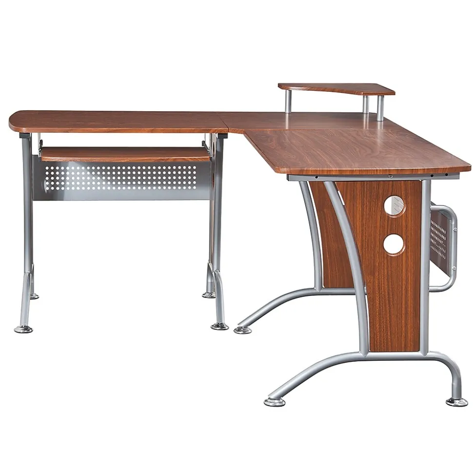 Get work done efficiently with this L-shaped computer desk. The MDF panels are constructed from heavy-duty material and feature a PVC laminate veneer finish, protecting against moisture, scrapes, and other wear. With an interchangeable design, this workstation offers enhanced versatility and makes it easy to accommodate various room shapes. This Techni Mobili deluxe computer desk has a raised shelf for additional storage options and has a retractable keyboard tray, saving desktop space and providing a clean appearance.