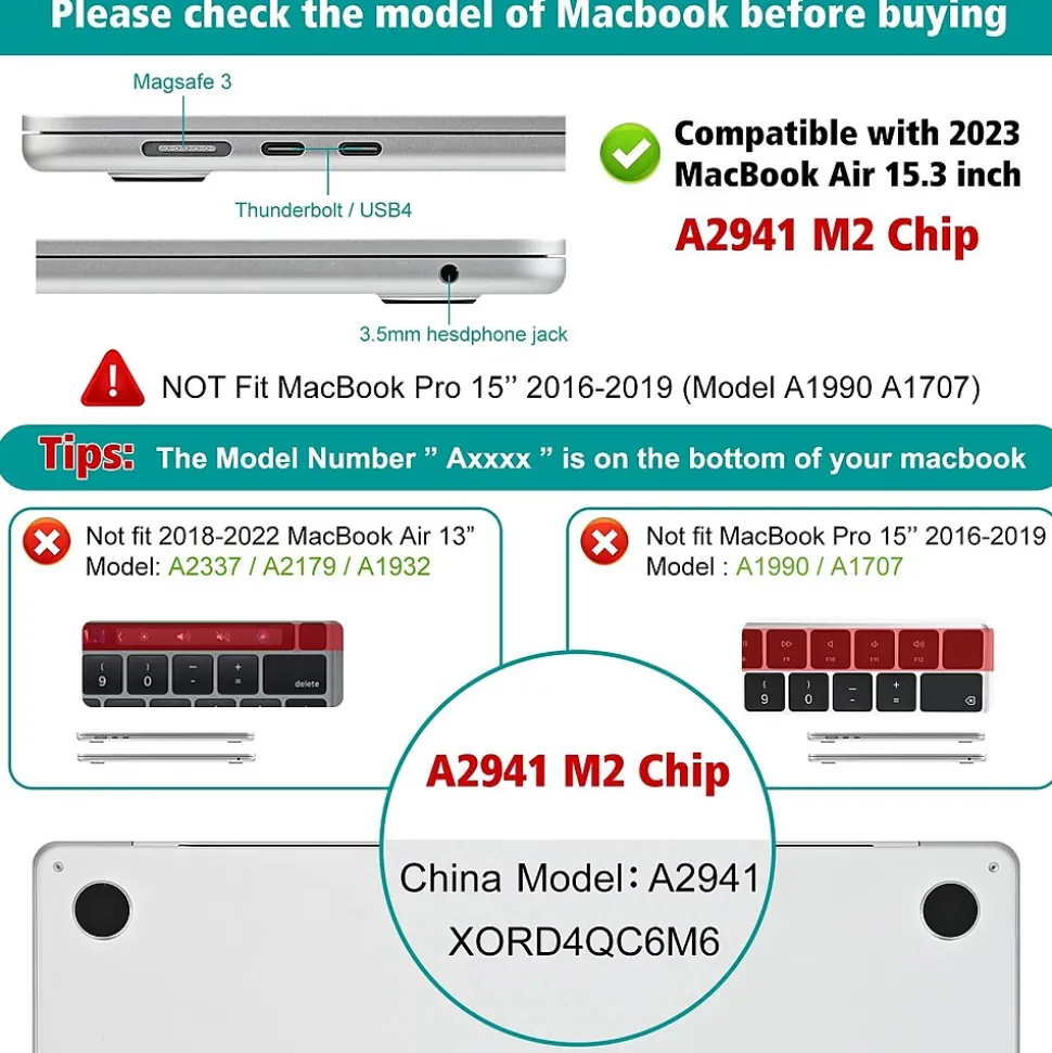 - Only compatible with the new 2023 M2 Chip MacBook Air 15 inch (Model: A2941) with Liquid Retina Display & Touch ID & MagSafe Charging Port.