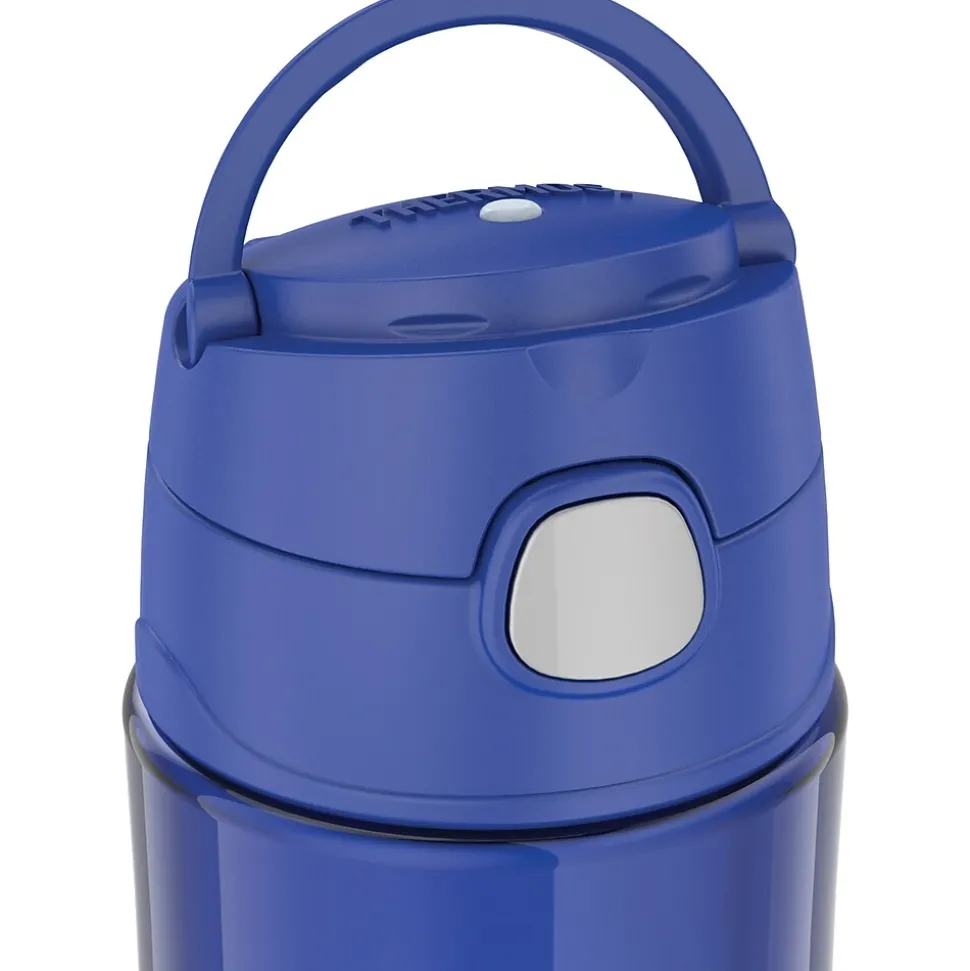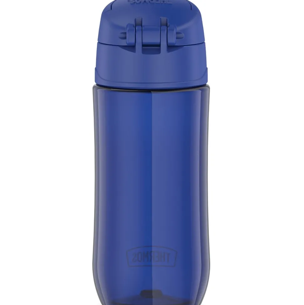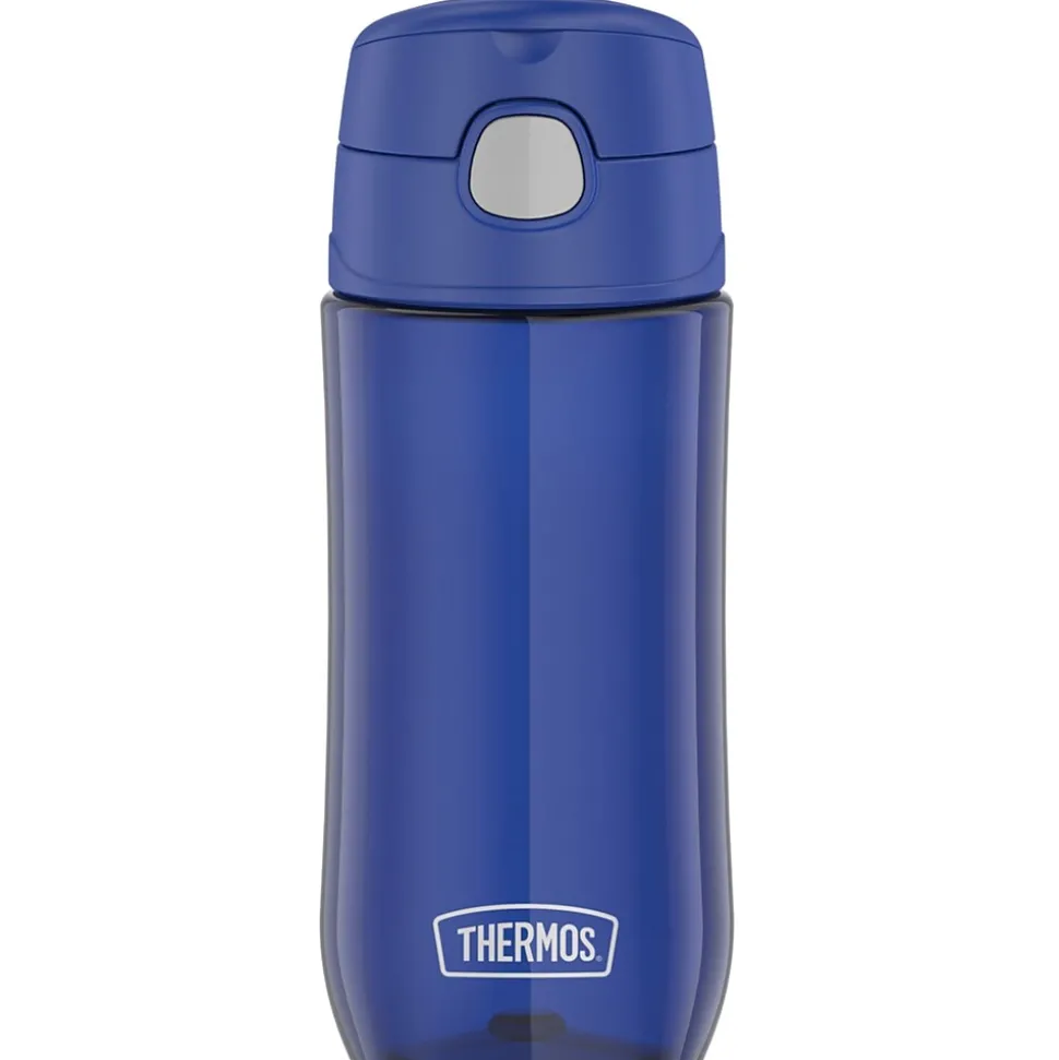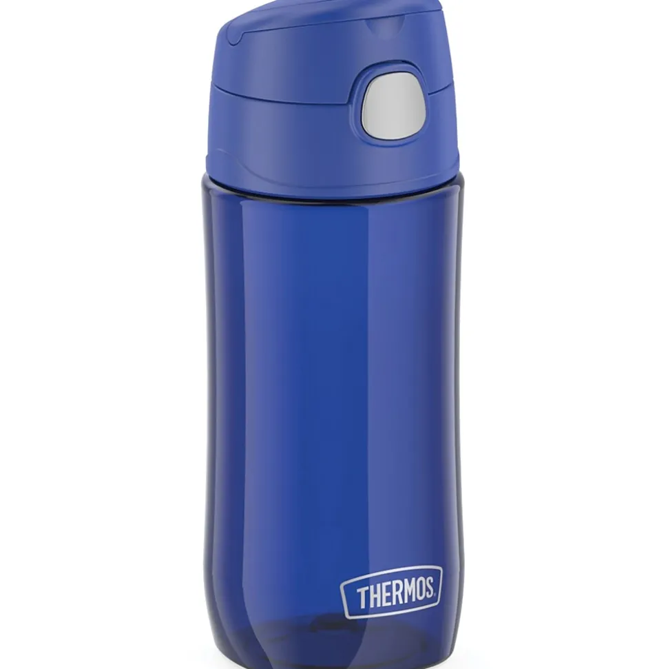 The Thermos 16 Oz. Blueberry Kids Plastic Water Bottle is ready to keep up on little adventures. Made with durable and dishwasher-safe Tritan plastic from Eastman Kodak material, it’s designed to survive whatever your future explorer has in store. Help keep germs away with the hygienic covered drinking spout. The push button lid allows for easy 1-handed opening. It comes equipped with a carry handle that folds down when not in use. The bottle is not for hot liquids.