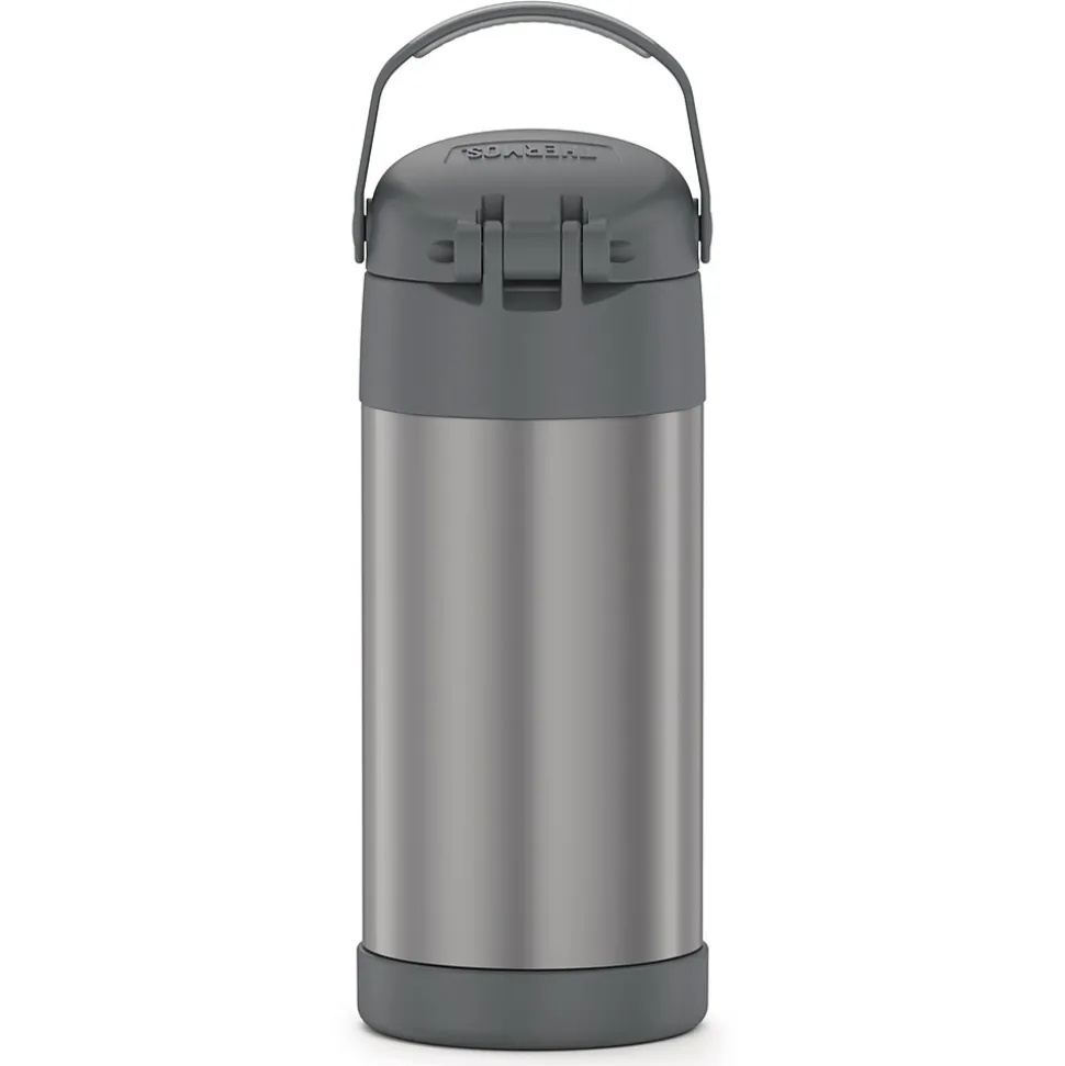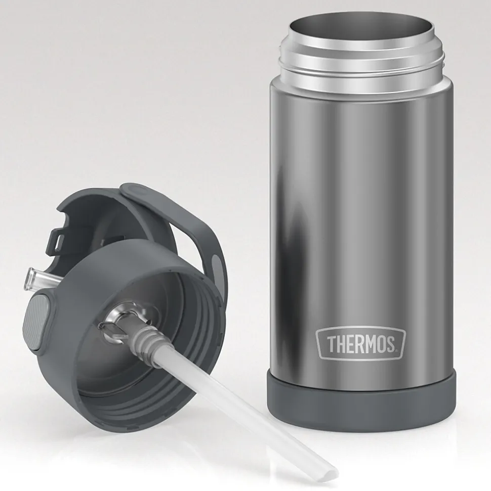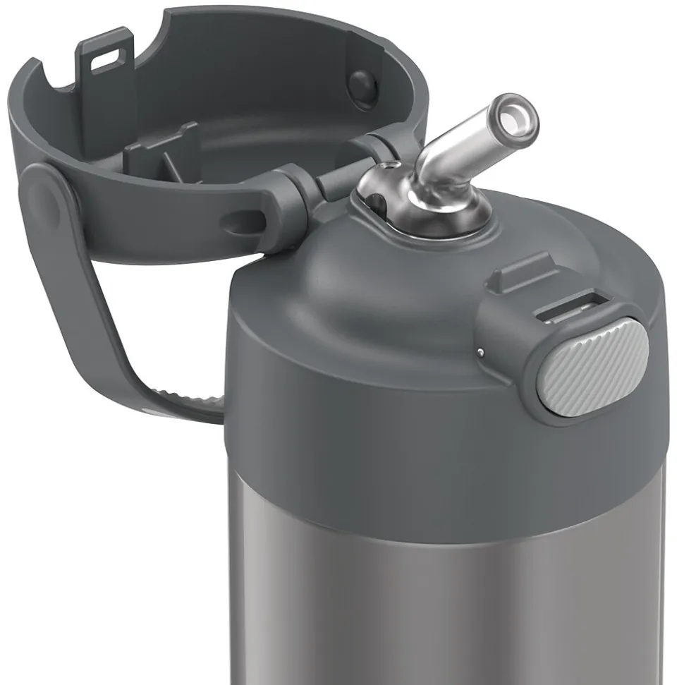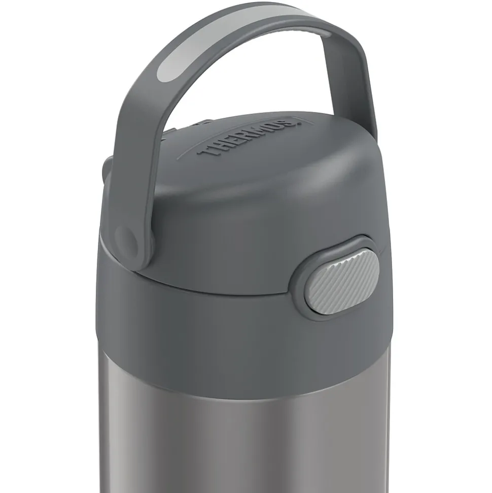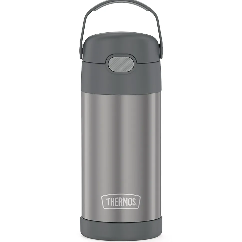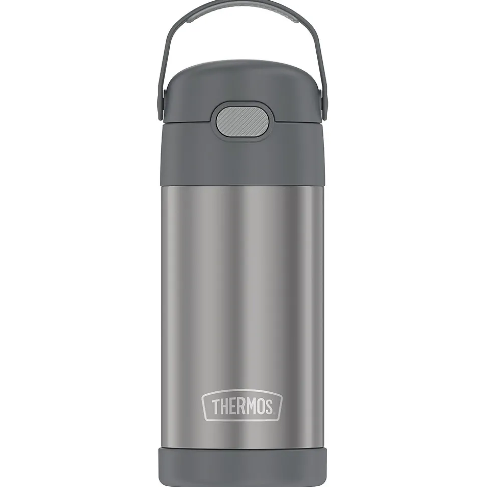 The Thermos 12 Oz. FUNtainer Stainless Steel Bottle keeps drinks cold for up to 12 hours. The double wall stainless steel construction is built to handle drops, dings and assorted roughhousing. Featuring a hygienic, push-button lid, this bottle is easy to open and drink from. To clean, you can pop your Gray FUNtainer Bottle in the dishwasher; however washing by hand is recommended.
