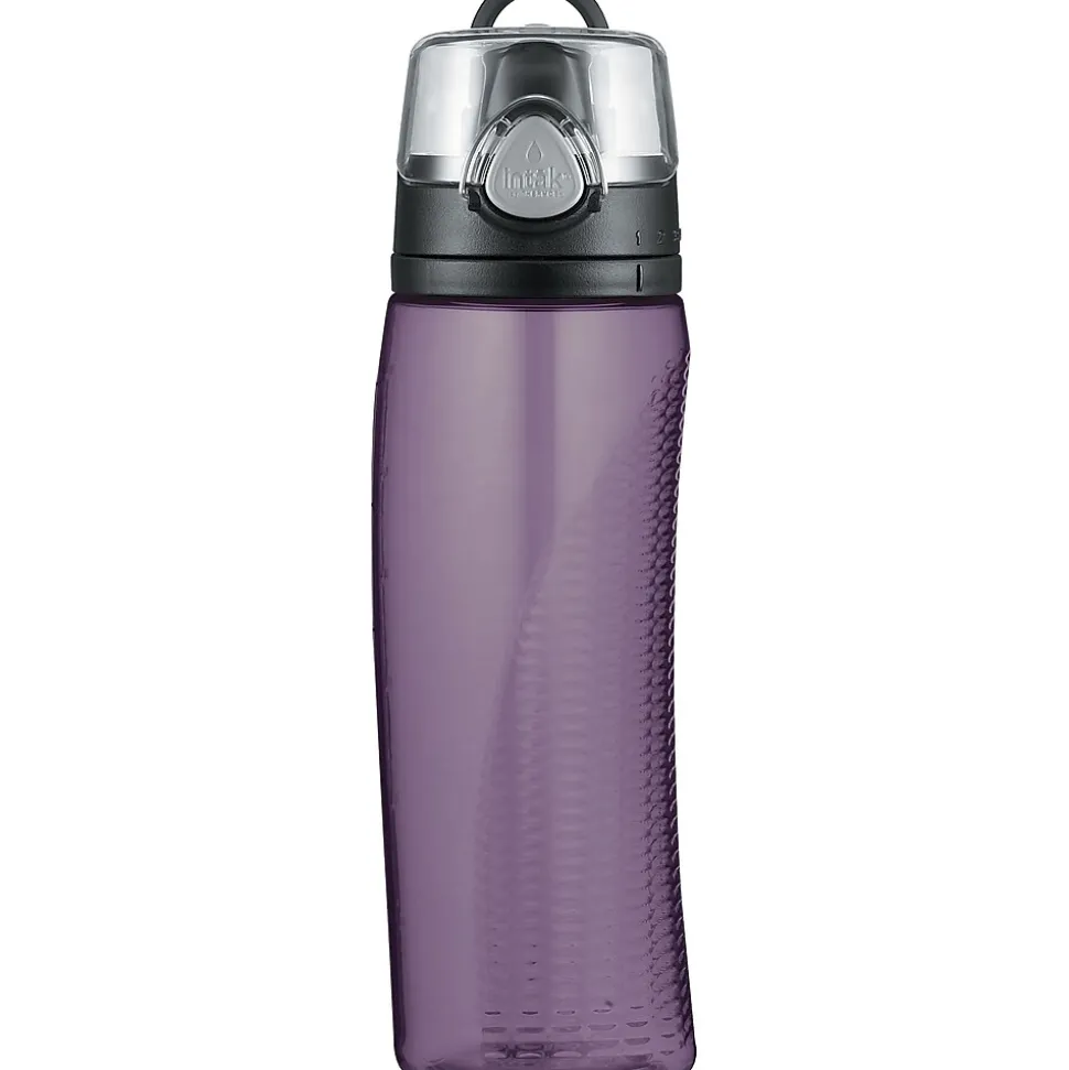 Thermos® Intak® Hydration bottle in purple color is made of impact-resistant Eastman Tritan™ copolyester for durable use. Bottle of 24 oz capacity features push button operation and has a rotating meter that lets you monitor water level.