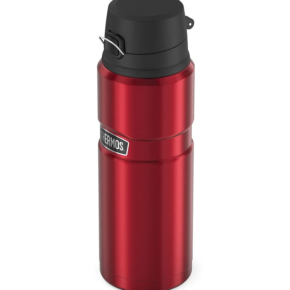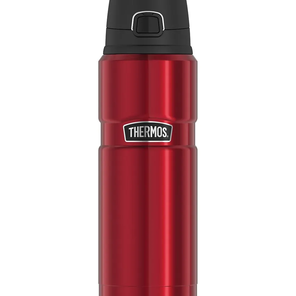 The Thermos 24-Oz. Stainless King Vacuum-Insulated Stainless Steel Drink Bottle is built to last and loaded with features to make for a more enjoyable drinking experience. Thermos™ vacuum-insulation technology virtually eliminates temperature change within the beverage container by creating an airless space between two stainless steel walls. The result is a superior insulated container you can depend on to keep your beverages hotter, colder, fresher, longer. This bottle is ideal for all day beverage enjoyment as it keeps beverages hot for up to 12 hours or cold for up to 24. Its sleek design is both eye-catching and functional. The Matte Red bottle’s specially designed lid features a smooth flow design that helps control the flow of warm liquid and comes equipped with a locking lid which operates simply with the push of a button.