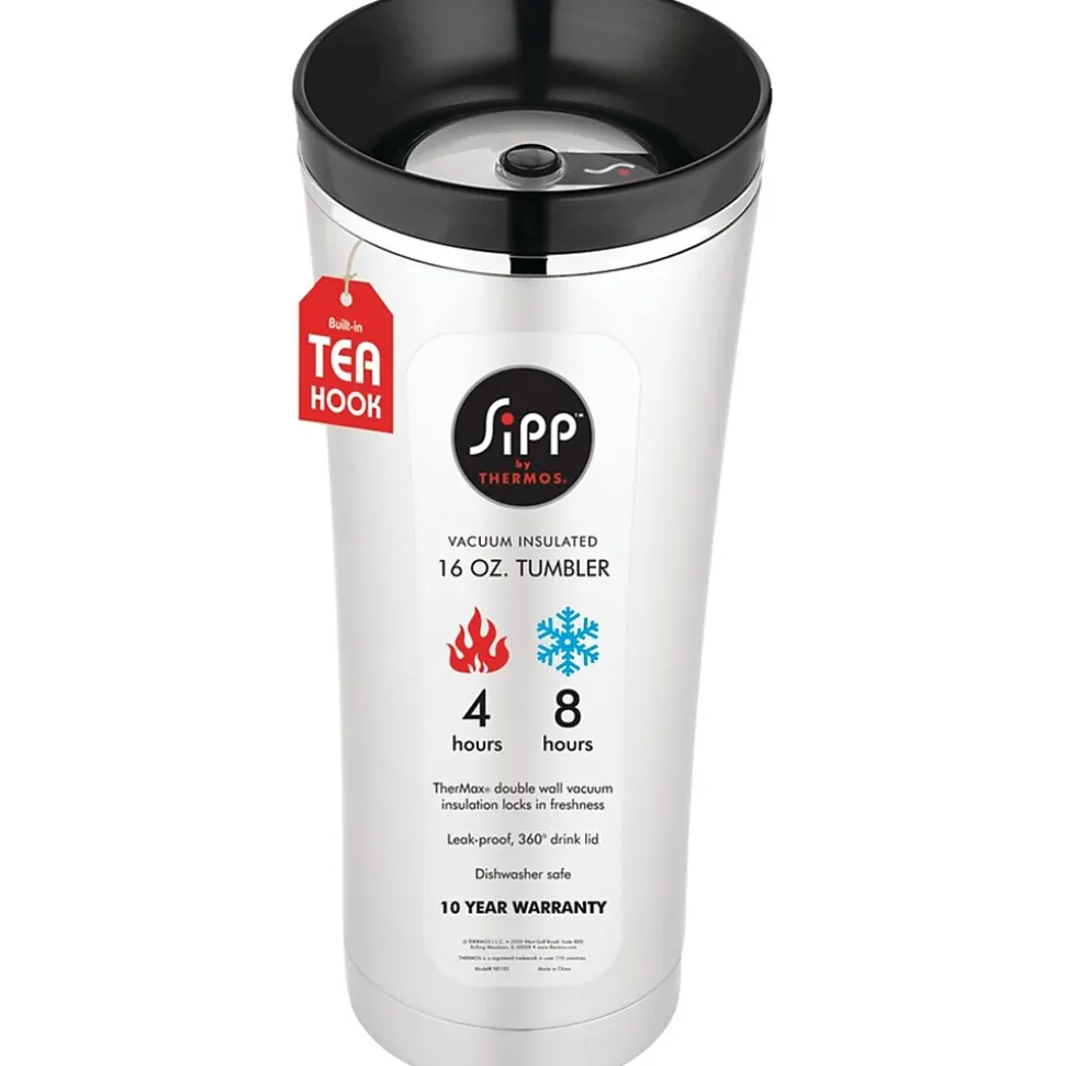 Thermos® Sipp Black tumbler keeps hot beverages hot for up to 5 hours and keeps cold liquids cold for up to 9 hours. Tumbler is made out of double wall vacuum insulation which offers maximum temperature retention.