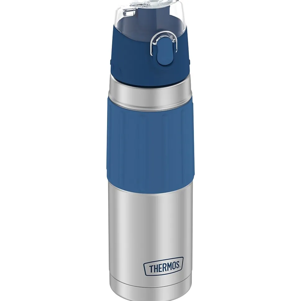 Thermos products deliver what matters every time. As the leading manufacturer of convenient insulated products for over 100 years, Thermos is trusted by consumers to provide innovative portable containers that promote a safe and healthy lifestyle. Thermos delivers when it matters. Thermos brand products offer superior cold retention that keeps beverages cool and delicious for hours, and the 18 Oz. Stainless Steel Hydration Bottle is no exception. Thermos vacuum-insulation technology virtually eliminates temperature change within the beverage container by creating an airless space between 2 stainless steel walls. The result is a superior insulated container you can depend on to keep your beverages colder, fresher, longer. Constructed with double wall stainless steel, this Slate Blue 18 oz. bottle is virtually unbreakable and built to withstand the demands of everyday use. A comfortable silicone grip makes the bottle easy to grasp and the bottle is sized to fit most automobile cup holders. It comes equipped with a hygienic, push-button, locking lid which can be operated easily with one hand. And because of the double wall insulation, the stainless-steel body stays condensation-free with cold beverages.