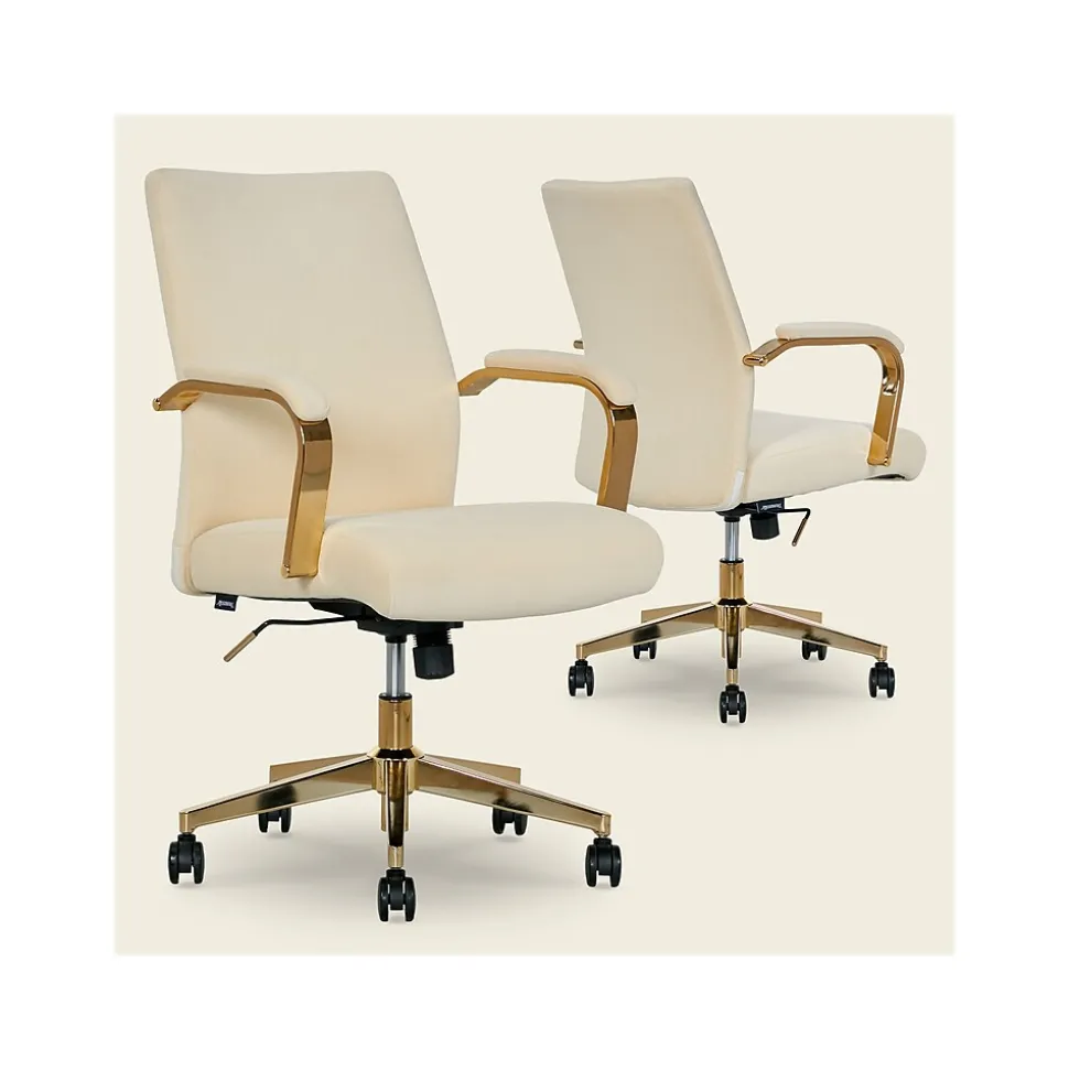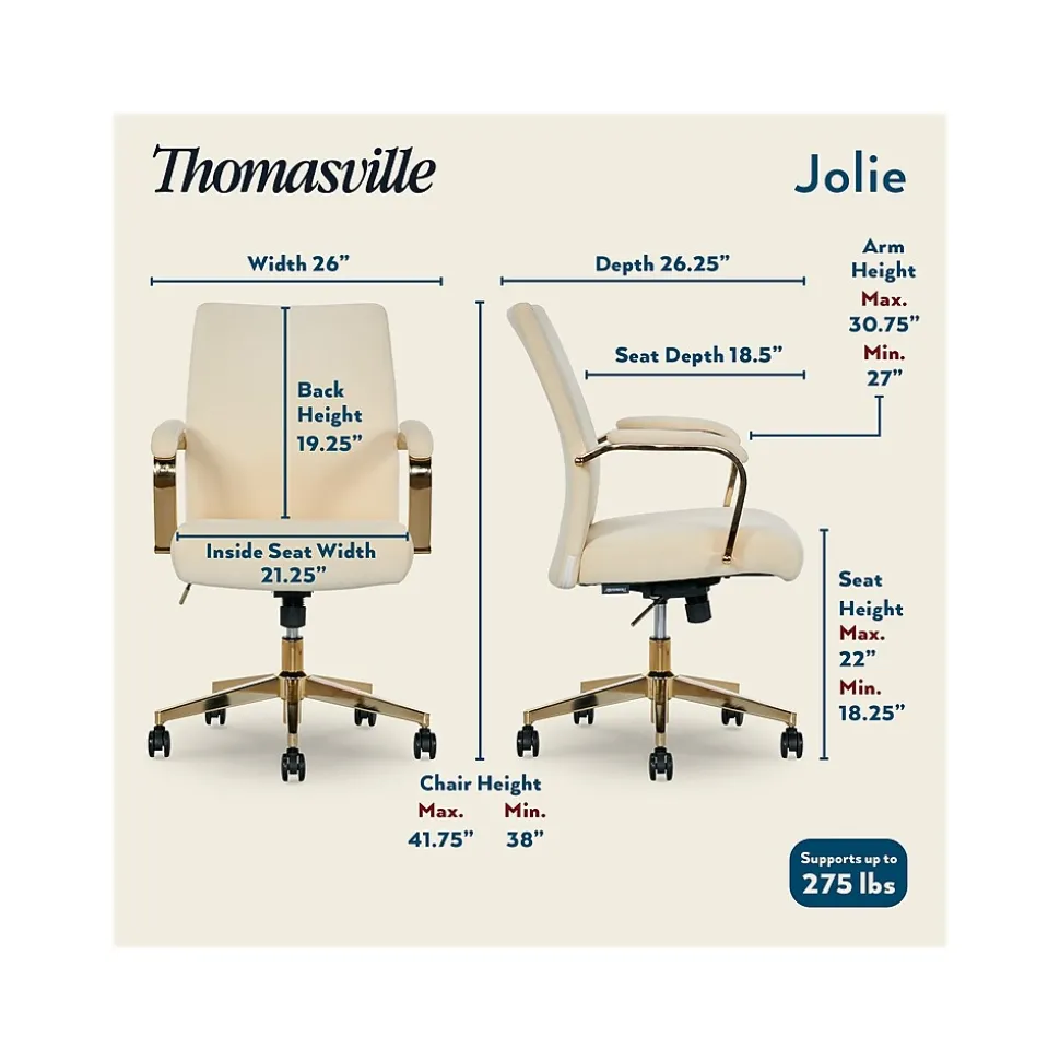 Featuring plush cushioning, clean lines, and a tailored silhouette, the Thomasville Furniture Jolie office chair is an inviting blend of comfort and style. With the velvety microsuede upholstery and metal frame in gold-tone plating, this office chair is well-suited to a range of decors. Ergonomic and adjustable, this modern desk chair is fitted with a pneumatic lift mechanism to control the seat height for optimized body alignment. Finished with sturdy rolling wheels, this executive office chair allows you to move quickly and efficiently. Bring sophisticated style to any office with this chair.