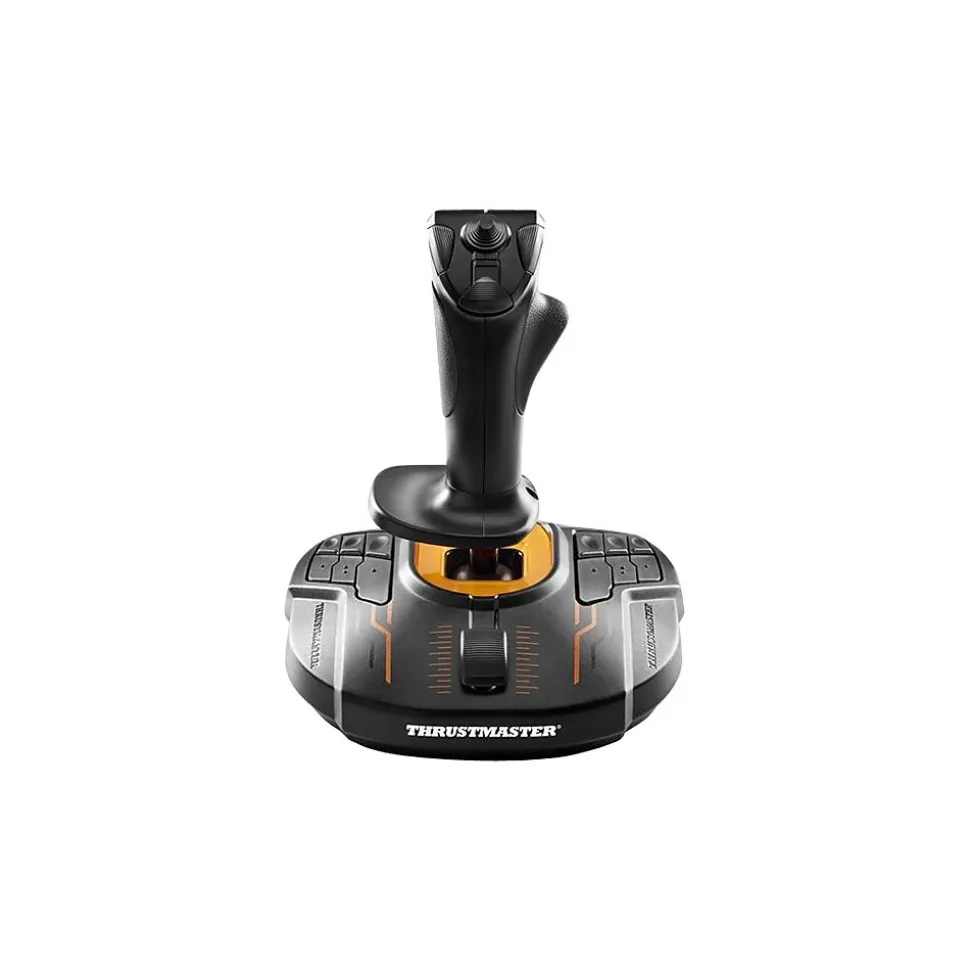In order to guarantee exclusive high-precision performance, pitch and roll on the T.16000M FCS flight stick employ H.E.A.R.T HallEffect AccuRate Technology for 16-bit resolution – the same pinpoint accuracy delivered by the extremely high-end HOTAS Warthog joystick, allowing gamers to engage their enemies with surgical precision. The helical spring inside the stick provides firm, linear and smooth tension. The T.16000M FCS features 4 independent axes, including twist rudder (controlled by rotating the stick), 16 action buttons with braille-style physical button identification, one 8-way Point of View (PoV) hat switch and an ergonomic trigger. Its striking orange accents and backlighting bring gamers’ immersion to a whole advanced level. Thanks to its design and ergonomics, the T.16000M FSC HOTAS provides players with multiple recognizable features, allowing them to become more effective and accurate when in flight. This enhanced access to flight controls proves even more essential when players are fully immersed in the exceptional flight experience delivered by VR-compatible games. The T.16000M FCS HOTAS is the natural and intuitive way to sit in a cockpit with one’s hands on the throttle and stick.