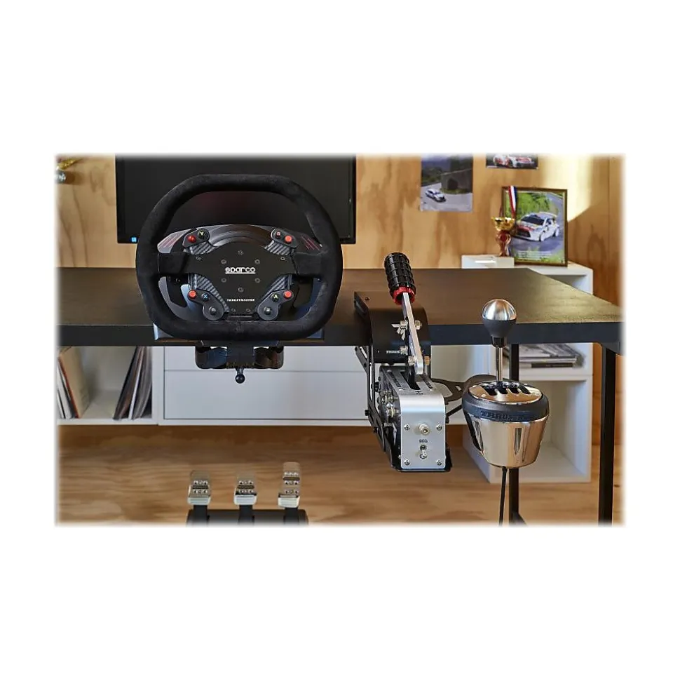 The Thrustmaster TM racing clamp is a rock-solid table clamp that allows sim racers to firmly mount their TSS handbrake and TH8A shifter, directly on a table/desk without the need for a cockpit. The Thrustmaster TM racing clamp is designed to offer a true-to-life racing experience by providing a solid stand for Thrustmaster add-ons. Features a robust, secure, and firm attachment system that is adjustable for many different setups.