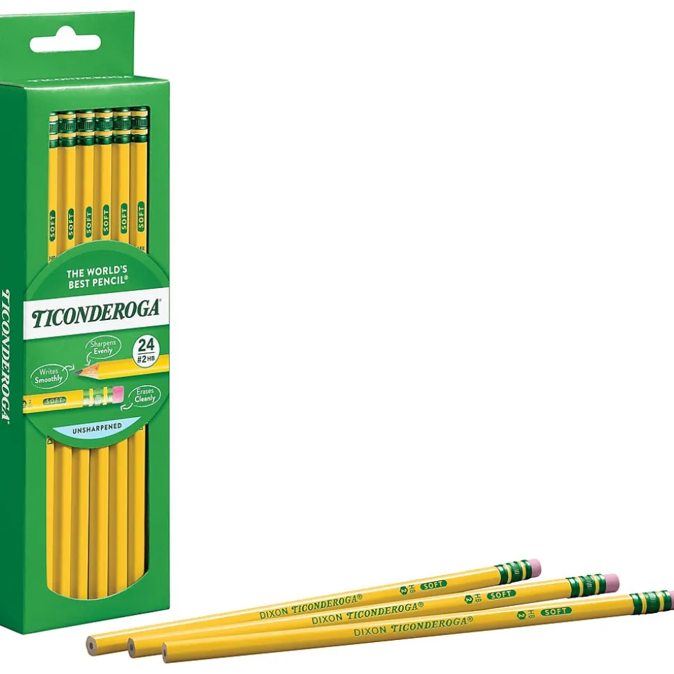 Write easy-to-read notes with these Dixon Ticonderoga wood-case #2 soft, yellow-barrel pencils. These pencils are sold in a pack of 24, which is ideal for busy offices and classrooms, and the solid graphite core delivers a smooth performance and easy-to-read text. These Dixon Ticonderoga wood-case pencils have a latex-free eraser to make it easy to correct mistakes on paper.