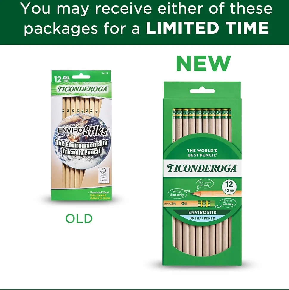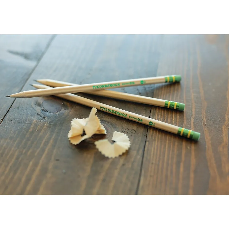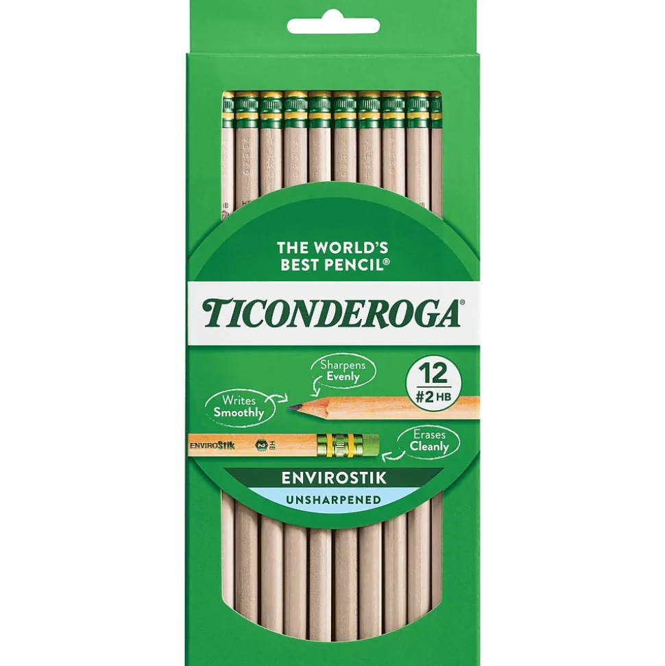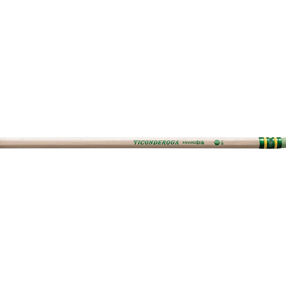 Ticonderoga® Woodcase pencil is made from reforested natural wood imprinted with certified non-toxic inks. Pencil has graphite core formula that provides extra smooth writing performance and has latex-free soft rubber for smudge-free corrections.