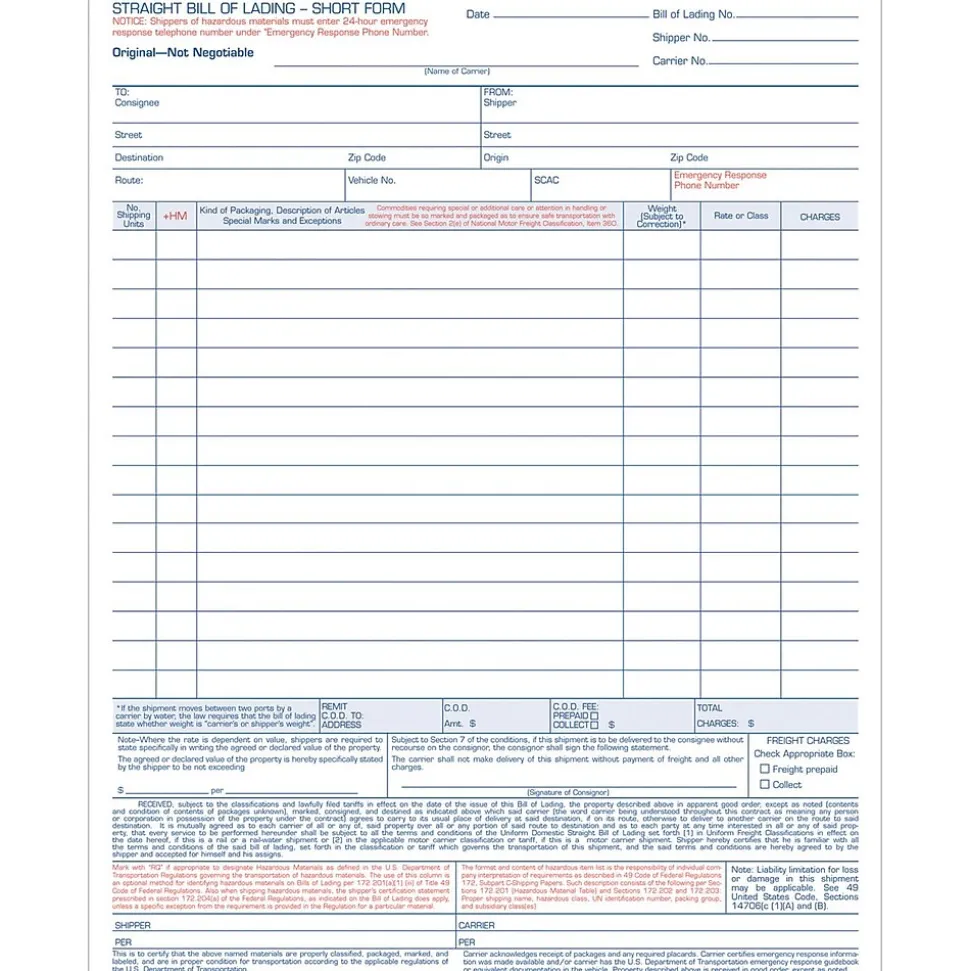 Simplified form to itemize 16 articles.Headings for article descriptions, shipping units, weight, rate and charges.Two-hole punched for post-binder filing.