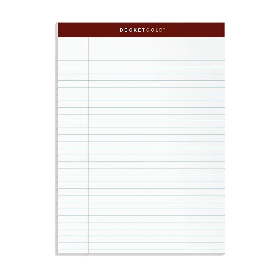 Tops Docket Gold legal-ruled white notepads have premium, 20-pound paper that allows for smooth pen strokes, while the extra-strong backing lets you write anywhere regardless of whether you have a stable writing surface. Legal-ruled lines organize your text into straight, readable lines to reduce confusion and increase legibility. A burgundy marble binding has a professional look and contains the perforations for each page.