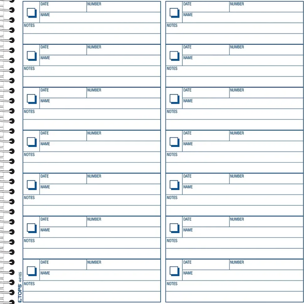 The cover flips back for easy writing in the car or at a payphone. 8-1/2″ x 8-1/4″, 14 messages per page, 1,400 messages per book, 5 books per box.