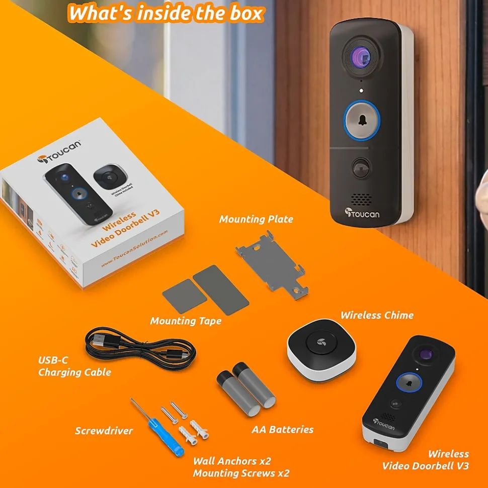 The Toucan Wireless Video Doorbell V3 – with Wireless Doorbell Chime -makes doorway security easy. The V3 uses the latest advance low powered Toucan developed PIR system for accurate motion detection. With our innovative power option using battery for a true wire free setup, and requires no hub means it is totally wire free for easy setup. Coupled with 1080p Full HD video resolution, you will always see what is happening around your home day or night.