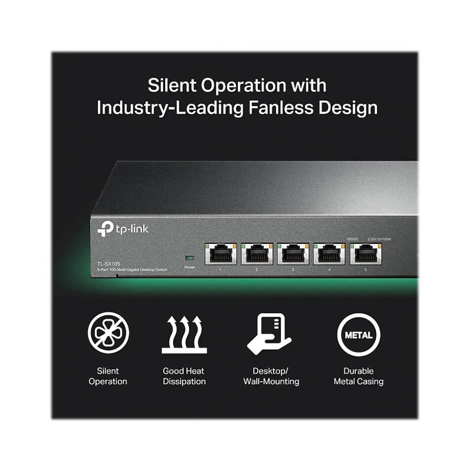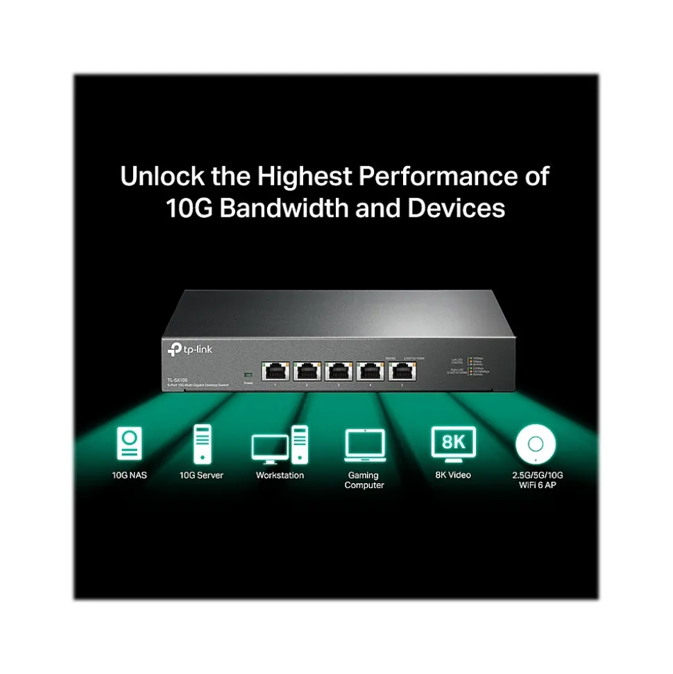 As the flagship 10G product, the TP-LINK TL-SX105 is a five-port 10G desktop switch, providing up to 100Gbps of switching capacity. Auto negotiation five-speed (100Mbps/1G/2.5G/5G/10G) connections sense the link speeds and intelligently adjust for compatibility and optimal performance for all your devices, including 10G NAS, 10G server, workstation, gaming computer, 2.5G/5G/10G Wi-Fi 6 AP, 8K video, desktop, and more.