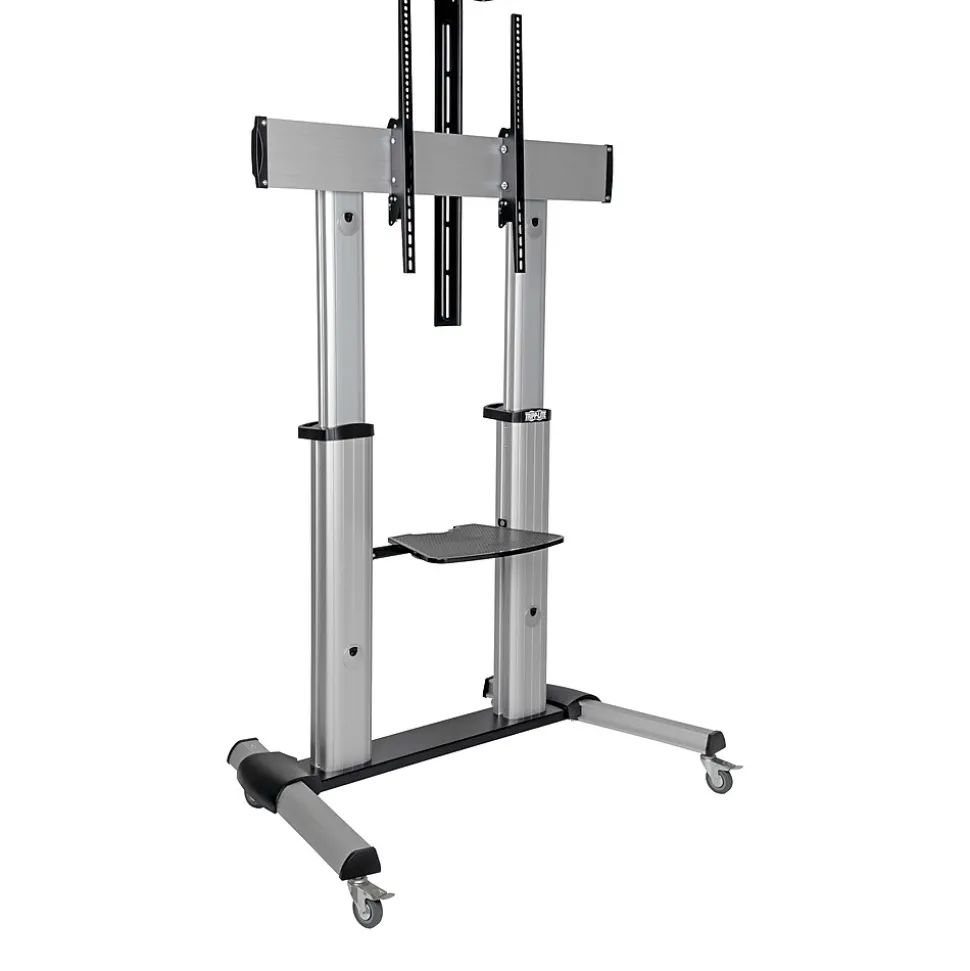 Features: Bring the Presentation to Your Audience :The DMCS60100XX combines a height-adjustable TV stand with the convenience of a rolling cart. Mount a flat-panel television, monitor or interactive whiteboard on this rolling TV cart and bring it to your audience in a classroom, lecture hall, office, conference room or other location where audio/video resources are shared. The DMCS60100XX accommodates most flat-panel displays from 60 to 100 inches, including Promethean whiteboards. It has an aluminum frame and supports up to 220 lb. Effectively Share Audio/Video Resources: An alternative to purchasing multiple displays, the DMCS60100XX allows a large screen and its peripherals to be shared within a facility and stored in a secure area. This heavy-duty TV stand has four sturdy swivel casters that move smoothly through doorways and over thresholds. The casters lock to keep the stand in position while at rest. Each column has a handle to help you guide the cart’s movement. Easily Mount Your 60″ to 100″ Display and Adjust the Viewing Angle :The columns telescope in 2-inch increments, so you can adjust the height of the display mounting bracket from 47 to 65 inches above the floor. For hassle-free display compatibility, this rolling TV stand for flat-screen TVs supports the following VESA mounting hole patterns: 200 x 200, 300 x 300, 400 x 200, 400 x 400, 600 x 400, 800 x 400, 800 x 600 and 1000 x 600. The display angle can be adjusted from +5 deg. to -10 deg. for optimal viewing. Conveniently Place Peripherals and Manage Cables :The upper shelf holds a webcam or small projector. The lower shelf holds a laptop or an audio/video component, such as a Blu-ray player. Add a clamp-on surge protector to the lower shelf to provide power protection for devices. The height of both shelves is adjustable. Cable management openings in the columns allow you to route power and connection cords, reducing clutter for a clean, professional look.
