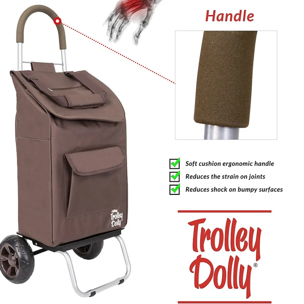 The Trolley Dolly is great to transport items around while on-the-go, downtown or the business. Large comfortable handle with rubberized grip reduces the shock when it is being pulled. Oversized, beefy wheels allow smooth rolling on any surface, even uneven paths. Removable shopping bag features seven compartments and pockets including a beverage holder. It is made of strong, weatherproof material. Remove the shopping bag, and the Trolley transforms into a Dolly for amazing weight capacity of 110 lb. The Trolley Dolly is the ideal solution to move a wide variety of items with ease. It folds in half the size of traditional trolleys for compact storage anywhere when not in use. The frame is made of durable aluminum.