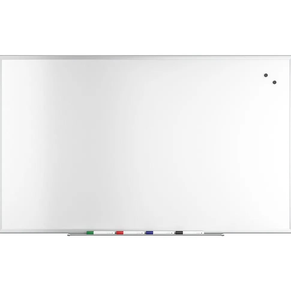 This TRU RED™ whiteboard features a durable, non-porous magnetic porcelain surface that prevents marker ink from penetrating the board and makes cleaning just as easy as writing. The magnetic surface of the board is perfect for brainstorming additions like papers, photos, or designs. The large surface area of the board is easy to care for, perfectly sized for use in the office or the home, with an added versatility that allows vertical or horizontal placement. Clean when necessary but know that those long-term ideas can stay up without worrying about leaving a permanent stain.