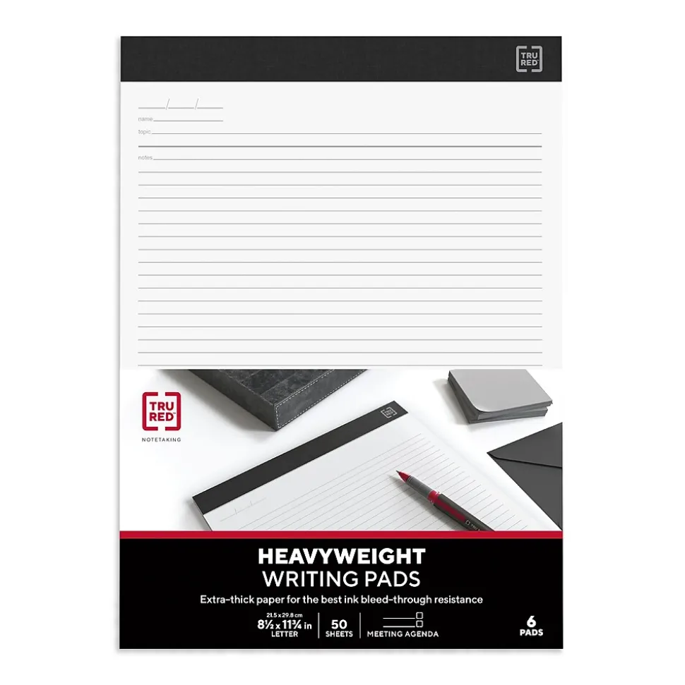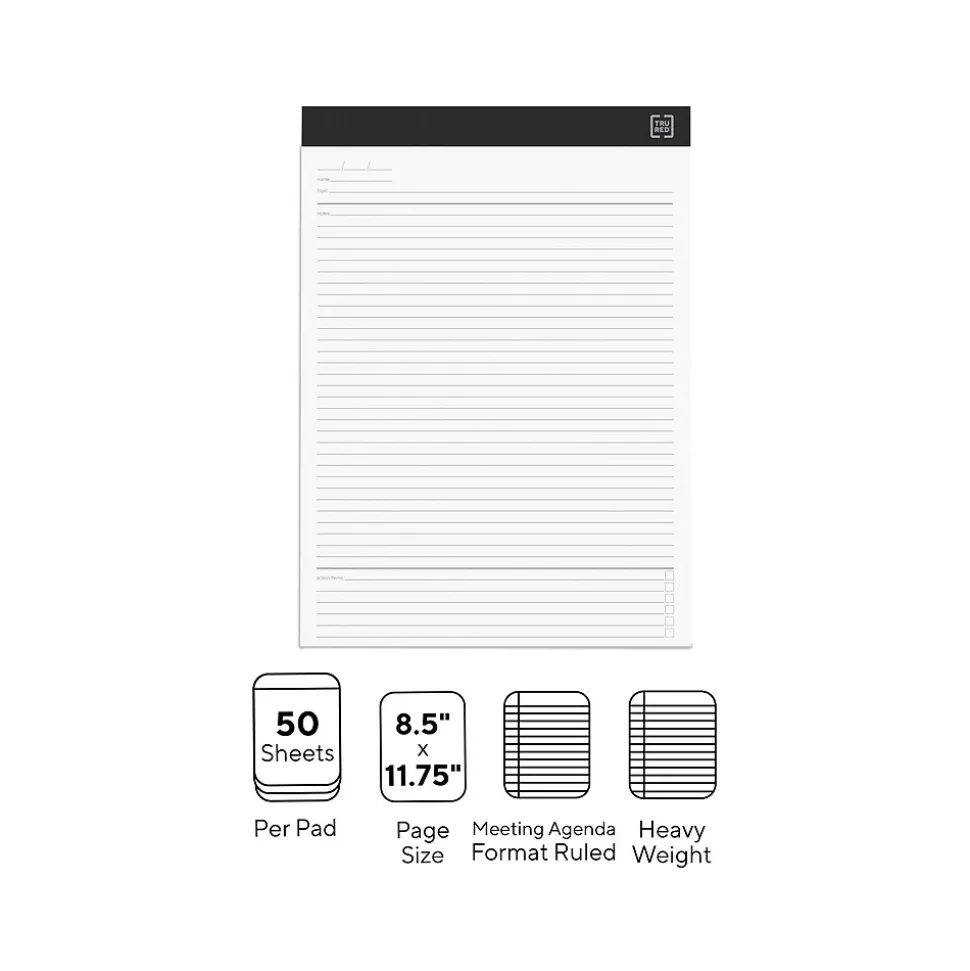 Provide a rigid surface for smooth writing with these perforated pad. The meeting agenda format helps you capture important details, while the perforated design makes it easy to share pages. Featuring a top-bound construction, this 20-pound paperweight notepad lets you flip through pages while reviewing written notes. The laminated backing on these TRU RED™ 8.5 x 11.75-inch white heavyweight pads matches the header color to deliver a professional look.