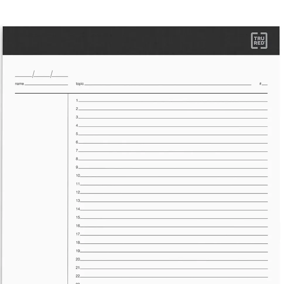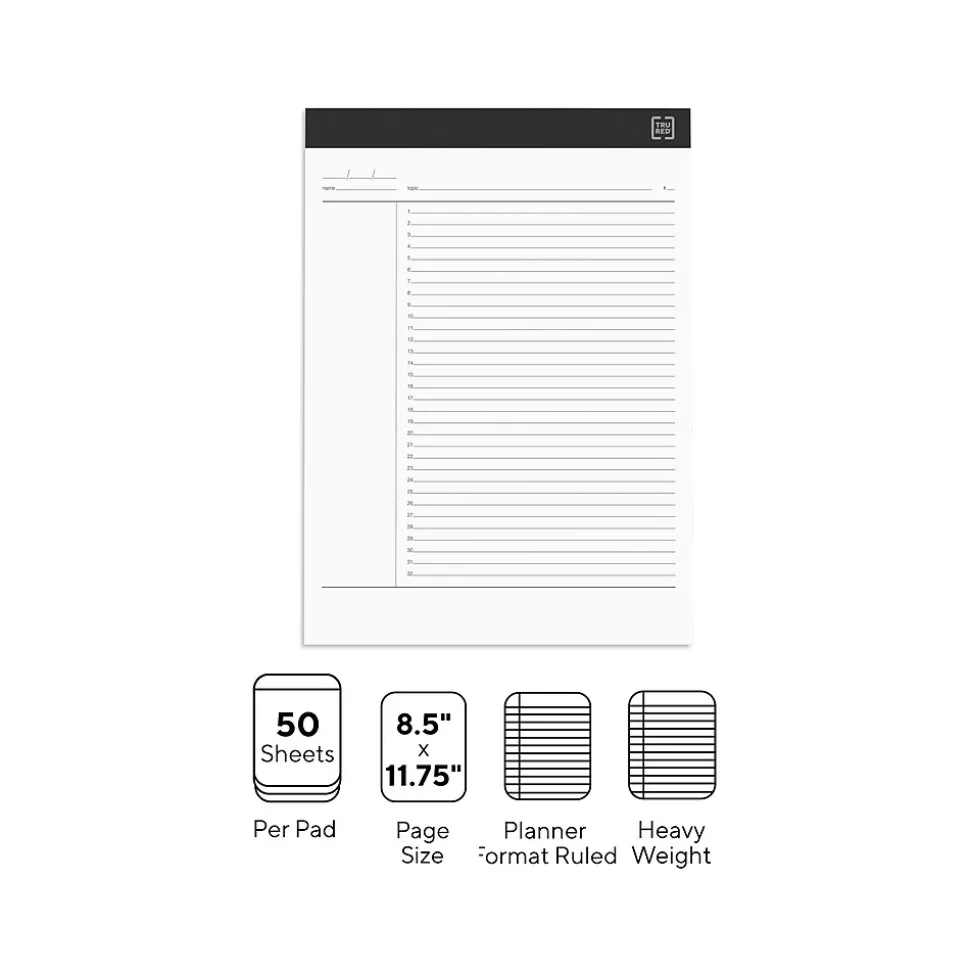 Write easily on the rigid surface of these heavyweight notepad. The top-bound construction lets you turn to a fresh page during note-taking, while the perforated design supports easy sharing. Featuring a project planning template, this notepad lets you capture important details for later review. These TRU RED™ 8.5 x 11.75-inch white heavyweight notepads has a 20-pound paperweight for a sturdy feel and durability.