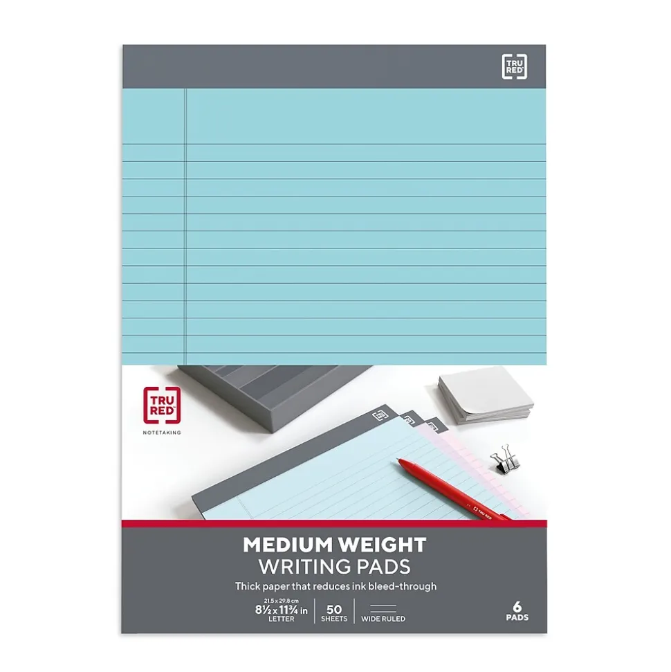 Get a reliable paper supply with these 50-sheet medium-weight ruled notepads. Convenient perforations let you remove sheets easily, while the top binding provides quick access to pages and information. The wide ruling helps you write within the lines for easy readability. These TRU RED 8.5 x 11.75-inch pastel medium-weight ruled notepads feature 18-pound paper and a 60-point backer for sturdiness and reliable performance.