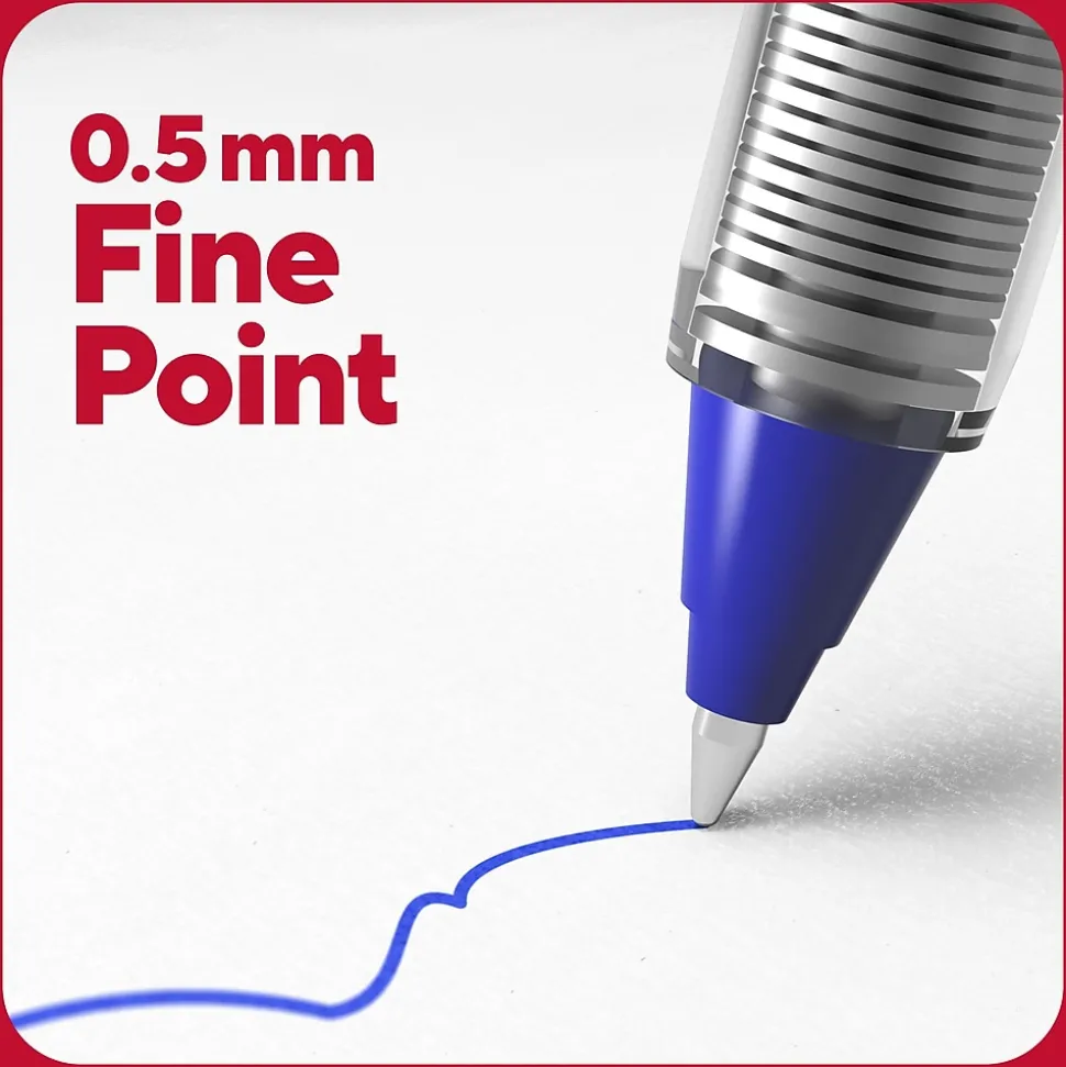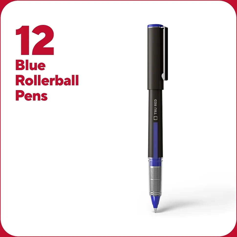 Fill your desk drawer with this ample supply of blue rollerball pens. The matte finish and carbon steel clip provide a professional look, while the airplane-safe construction lets you bring the pen inside pressurized cabins without leaks. Create crisp, clear lines using the 0.5mm conical tip. This TRU RED 0.5mm blue rollerball pen has a transparent window so you can see the ink level.