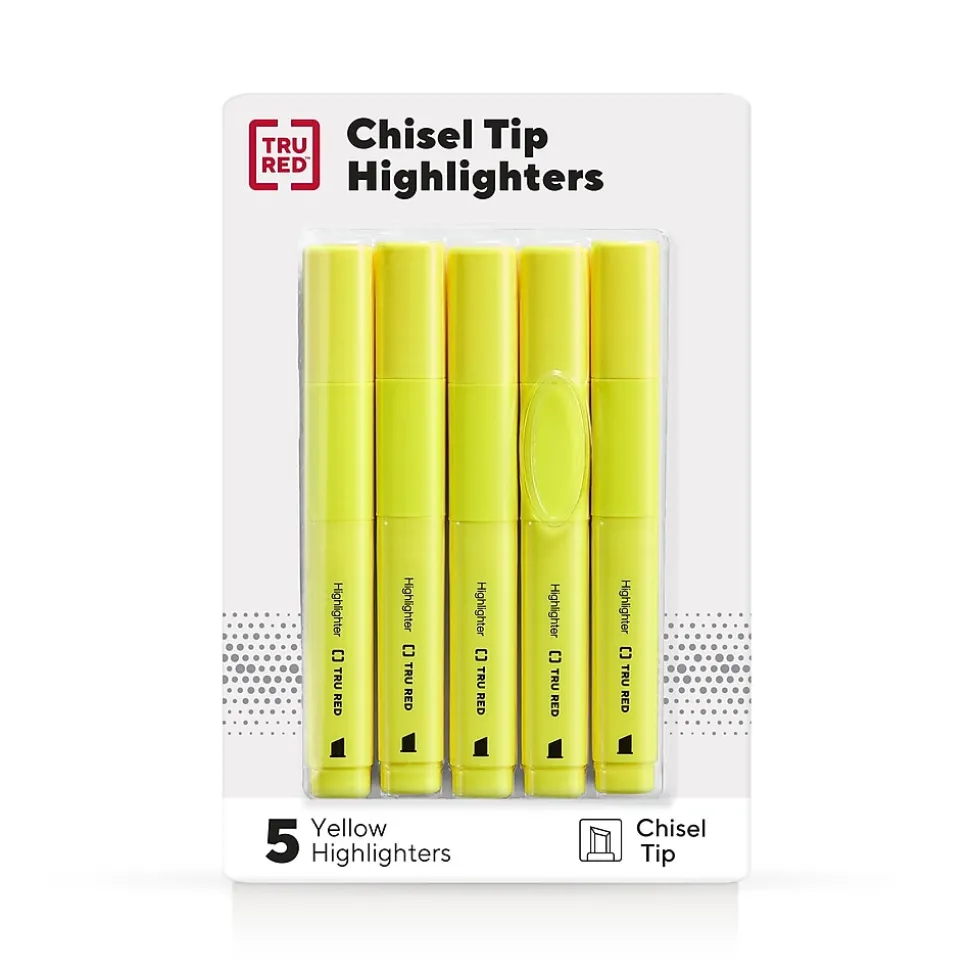 Highlight all the key information you want to remember in big swipes of bold color or create bright, thin lines for important notes with these versatile chisel-tip highlighters. The vibrant fade-resistant ink helps to keep any marked documents clear for studies or work. A large tank size and ink reservoir are ideal for your biggest projects with up to 300 meters of ink life per marker. Our Squircle™ barrel shape offers a comfortable grip and keeps these highlighters from rolling away while rubberized grips provide extra comfort. The odorless, non-toxic TRU RED tank highlighters 5-pack can be shared with a team or classroom ready to focus in any space.