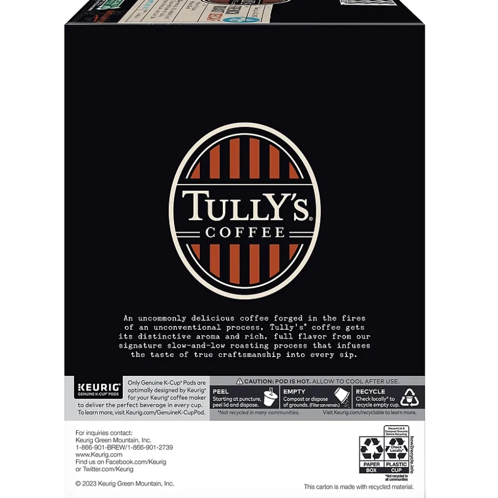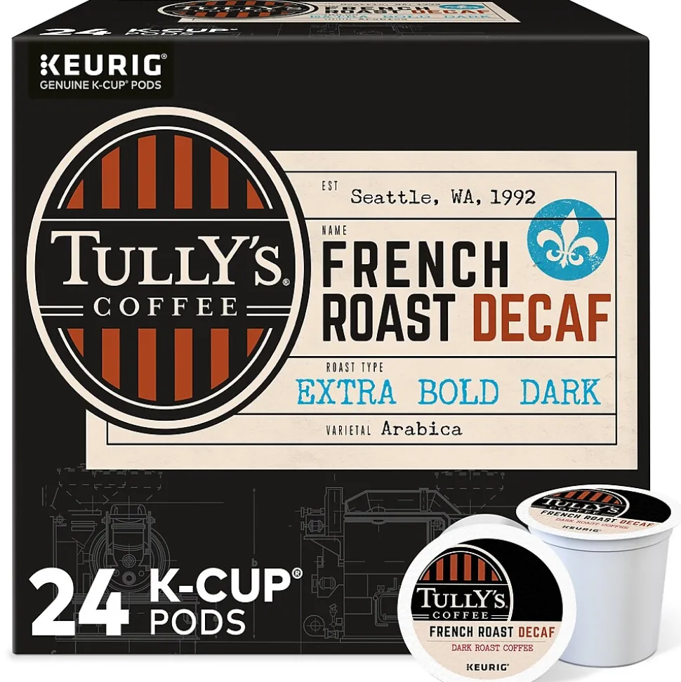 Enjoy the bold, bittersweet flavor of these coffee pods without the caffeine. Each pack comes with 24 pods, so there are plenty to stock up the break room cabinet, and the pod design makes it easy to brew just a single cup. These Keurig K-Cup Tully’s French Roast extra-bold decaf coffee pods are dark-roasted and deliver a robust taste.