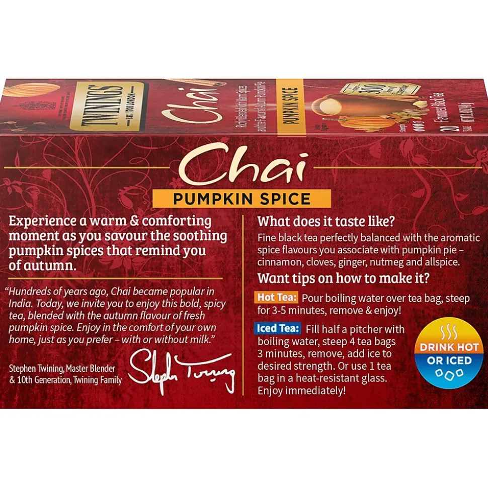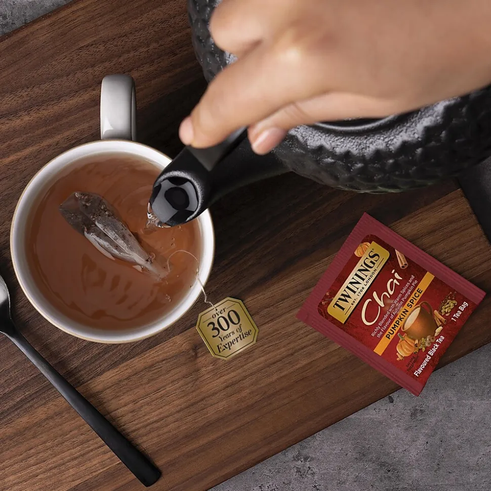 Twinings blends to perfection the finest black teas with the sweet and savoury spice flavors of cinnamon, cardamom, cloves and ginger to give you a line of great tasting Chai teas with a bold, spicy taste and rich, vibrant aroma.