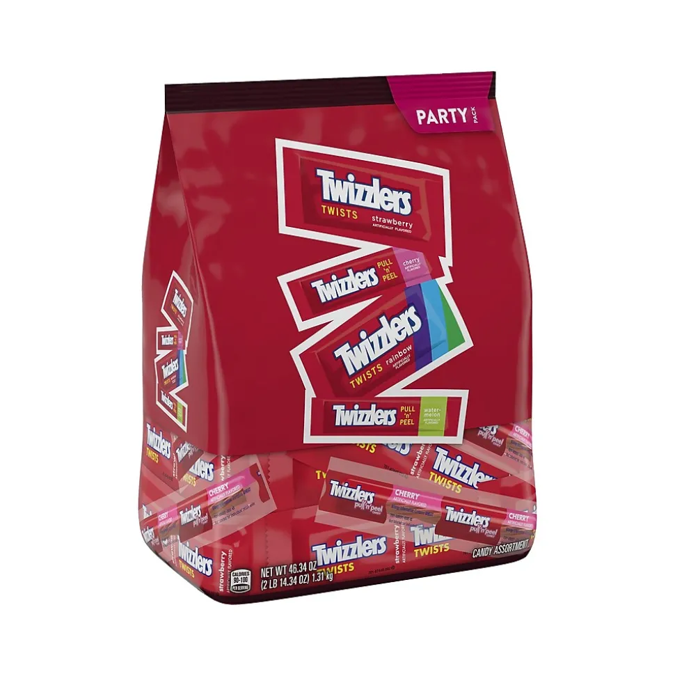 With a bulk party pack of assorted Twizzlers chewy candies ready for action, you’ll never find yourself without a delicious shareable snack. This party pack includes Twizzlers Twists Strawberry flavor chewy candy, Twizzlers PULL ‘n’ PEEL Cherry flavor chewy candy, Twizzlers Twists Rainbow flavor chewy candy, and Twizzlers PULL ‘n’ PEEL Watermelon flavor chewy candy. Whether you’re in the mood for a classic Twizzlers treat or want to try a new vibrant flavor, you’ll be set with this assortment party pack. Keep your pantry stocked with kosher-certified Twizzlers chewy candies, store some in your work desk, or take a bag on a road trip or to your next party gathering. Looking for an even greater adventure? For a unique twist, melt several white creme or milk chocolate bars (sold separately), dip your Twizzlers candies in the melted gooeyness, then cover each piece in sprinkles, and let the new treats cool. They even make scrumptious holiday treats for Christmas stocking stuffers, Halloween trick-or-treat bags, Easter baskets, and Valentine’s Day presents.