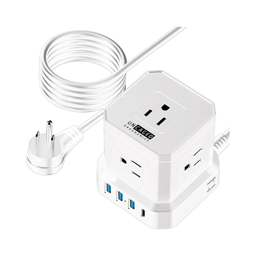 Power devices clutter-free with the Uncaged Ergonomics Cube multi-outlet surge-protected power strip. The cube-shaped design allows unhindered access to multiple outlets and USB ports, and the 10′ braided cable is long enough to position the small surge protector in the perfect spot. Using space efficiently, this power strip is more compact and creates less clutter than the long, cumbersome power strips. The plug orientation allows for simultaneous connection of five large cables (no more skipping outlets due to limited space). Safely power your products in a clean, efficient way with this sleek multi-outlet extension cable.