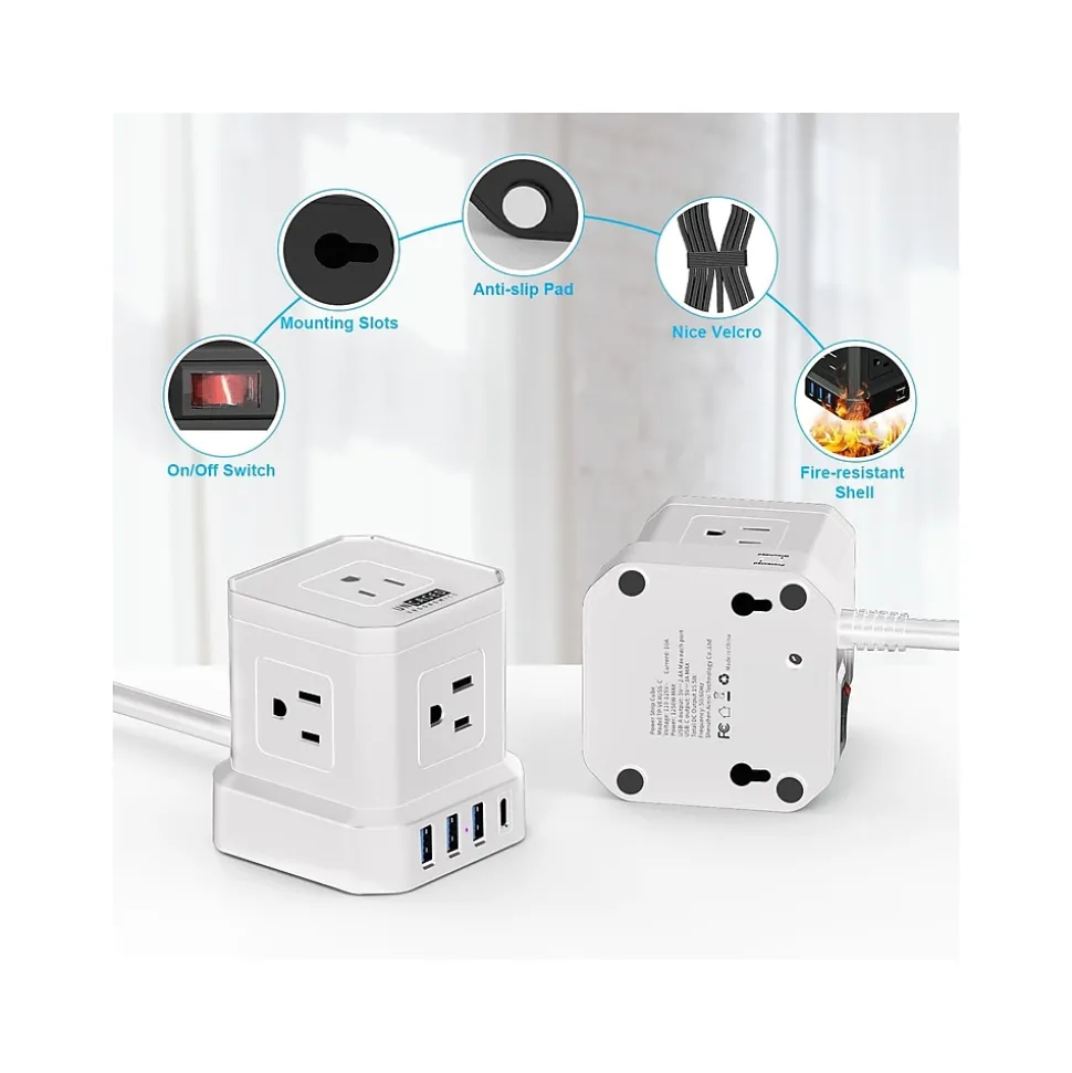 - Cube-shaped design allows for unhindered access to the multiple outlets and four USB ports