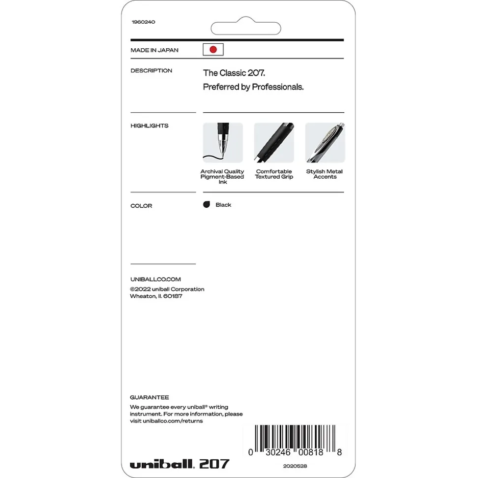 Prevent marks from smudging and smearing with this uni-ball retractable black gel pen. The 0.5mm tip is perfect for creating sharp marks for easy reading, while the retractable design prevents stray marks when not in use. This uni-ball Signo 207 retractable black gel pen has a metal clip for transporting in a pocket or notebook.