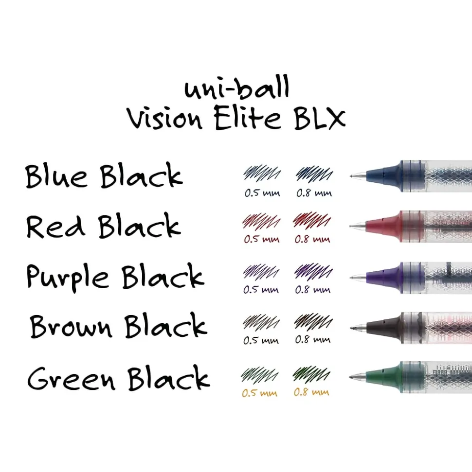 Give your writing a boldy infused flavor with Vision Elite BLX Rollerball Pens from uniball featuring a bend-resistant stainless steel 0.8mm bold tip and tungsten carbide rollerball. Capped roller pens deliver smooth, intense lines with unparalleled definition – useful for note taking, list making, signing checks and legal documents, and even uniquely embellishing creative writing projects. Innovative uni Super Ink technology effectively entraps the gel ink into the paper, producing fraud, fade and water-resistant documents that resist check washing or bleaching. These Vision Elite pens have a special design that withstands cabin pressure variances without leaking, making them useful for travelers. Exclusive Uni-Flow Ink System ensures a consistent, delightfully fluid writing experience, and a translucent window ensures that you don’t run out of ink unexpectedly. These sleek and modern roller pens come in an assortment of black ink infused colors, adding an element of drama to your every day tasks and creative writing projects – no matter the altitude.