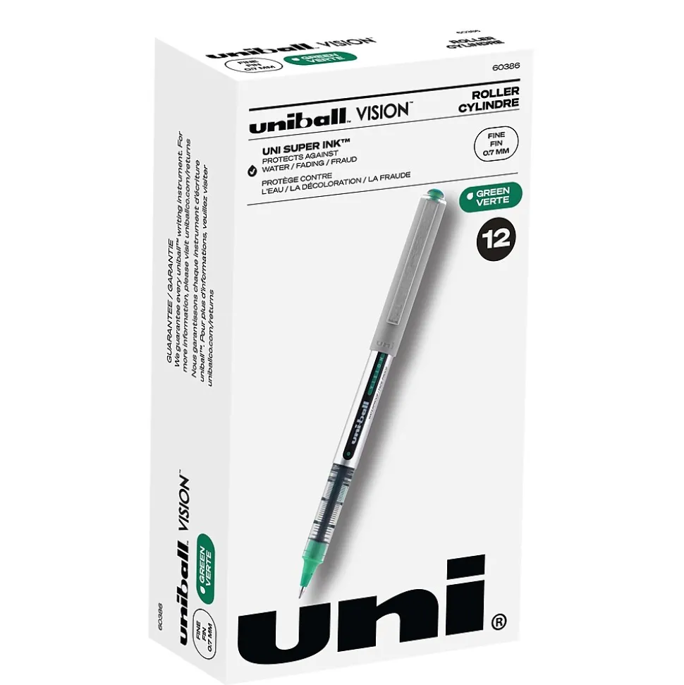 With its evergreen-colored ink and soft grip, the uni-ball Vision Stick Rollerball Pen will become your go-to writing utensil. Each pen set includes one dozen pens with durable stainless steel tips, ink windows and pocket clips.