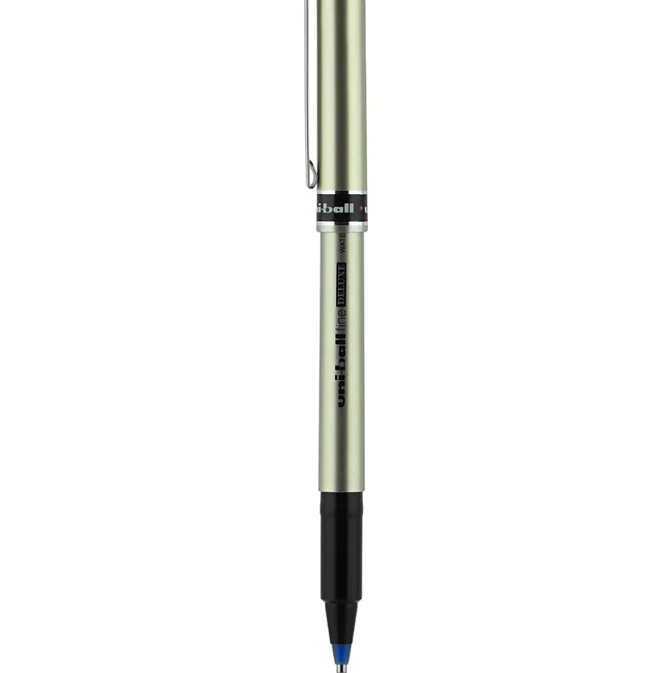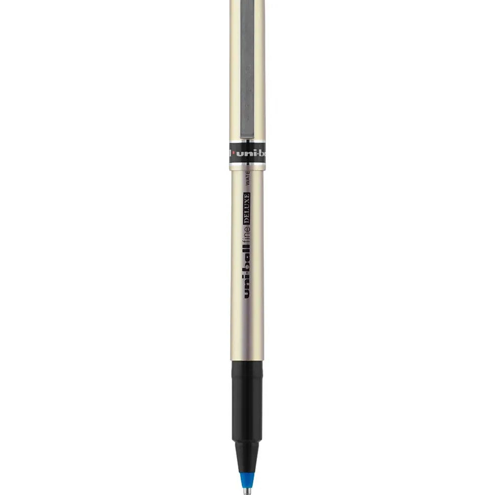 Fill-out documentation, create small labels, and work on other writing tasks with these fine-point rollerball pens. Specially formulated to trap ink within pages, these pens prevent check washing and other unauthorized alterations to documents. These uni-ball Deluxe blue pens have archival-quality ink, so you can easily preserve important papers, while the brushed-steel design provides a sleek and sophisticated look and feel.