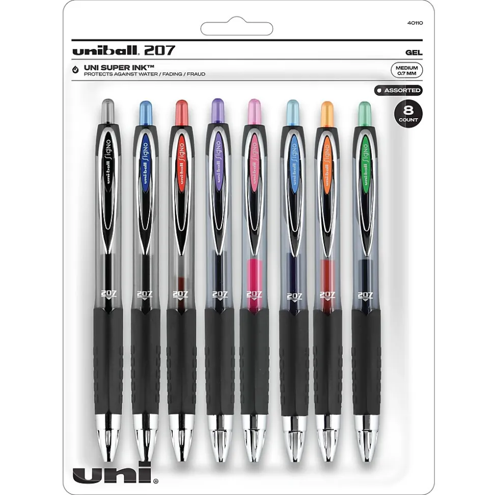 Stock your office, home or classroom with 207 Retractable Gel Pens from uniball featuring a 0.7mm medium point with a stainless steel tip that resists bending and breaking. Even-flowing, pigment-based gel ink delivers a smooth writing experience for intense, vibrant lines, ensuring that every mark is brilliantly communicated. Use these retractable gel pens for everyday writing tasks, check signing and all of your important signatures, trusting its quick-drying uni Super Ink. Innovative uni Super Ink technology effectively entraps the gel ink into the paper, producing fraud, fade and water-resistant documents that resist check washing or bleaching. The 0.7mm medium point strikes the perfect balance between bold and detailed lines. A textured grip offers greater comfort and control as you continue writing, while a translucent ink window indicates the level of gel ink remaining, so you don’t run out unexpectedly. The sleek design of the 207 with modern metal accents gives the retractable gel pen a stylish touch.
