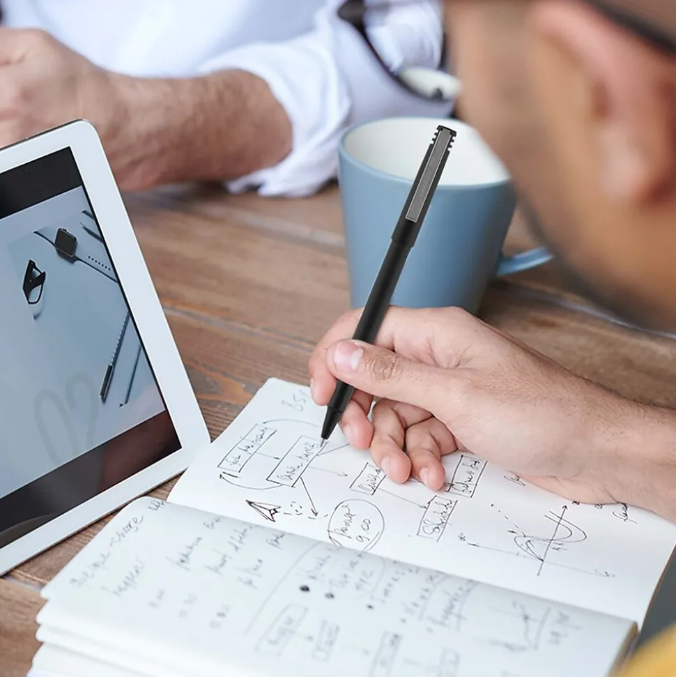Stock your office, home or classroom with Roller Rollerball Stick Pens from uniball featuring a strong, long lasting 0.5mm micro tip. This rollerball pen delivers the silky-smooth glide of a fountain pen without smudging for effortless writing. Micro point pens produce neat and precise lines for intricate writing, making it easy to create super fine details in your drawings and diagrams. Capped roller pens are useful for a variety of tasks from note taking to signing checks and legal documents to uniquely embellishing fun and creative writing projects. Innovative uni Super Ink technology forms a strong bond with the paper, protecting from water, fading and fraud. A great economic and environmental choice as this super sleek micro point roller pen is made from 80% post-consumer recycled material.