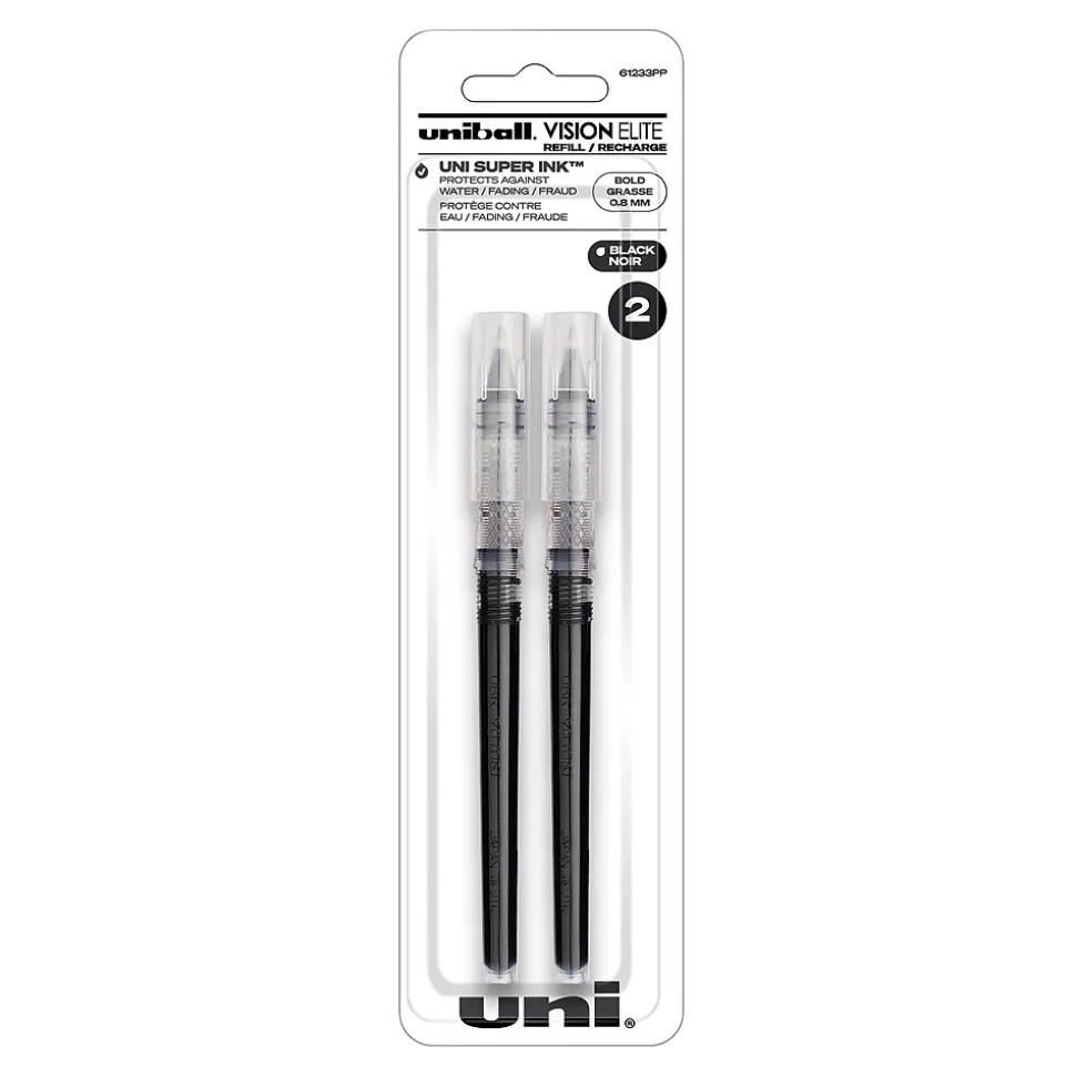 Create ideas as vividly as can be imagined with Vision Elite Rollerball Pens from uniball featuring a bend-resistant stainless steel 0.8mm bold tip and tungsten carbide rollerball. Capped roller pens deliver smooth, intense lines with unparalleled definition – useful for note taking, list making, signing checks and legal documents, and even uniquely embellishing creative writing projects. Innovative uni Super Ink technology effectively entraps the gel ink into the paper, producing fraud, fade and water-resistant documents that resist check washing or bleaching. These Vision Elite pens have a special design that withstands cabin pressure variances without leaking, making them useful for travelers. Exclusive Uni-Flow Ink System ensures a consistent, delightfully fluid writing experience, and a translucent window ensures that you don’t run out of ink unexpectedly. Express your signature style with the sleek, modern design and elite performance of uniball’s Vision Elite Rollerball pen – no matter the altitude.