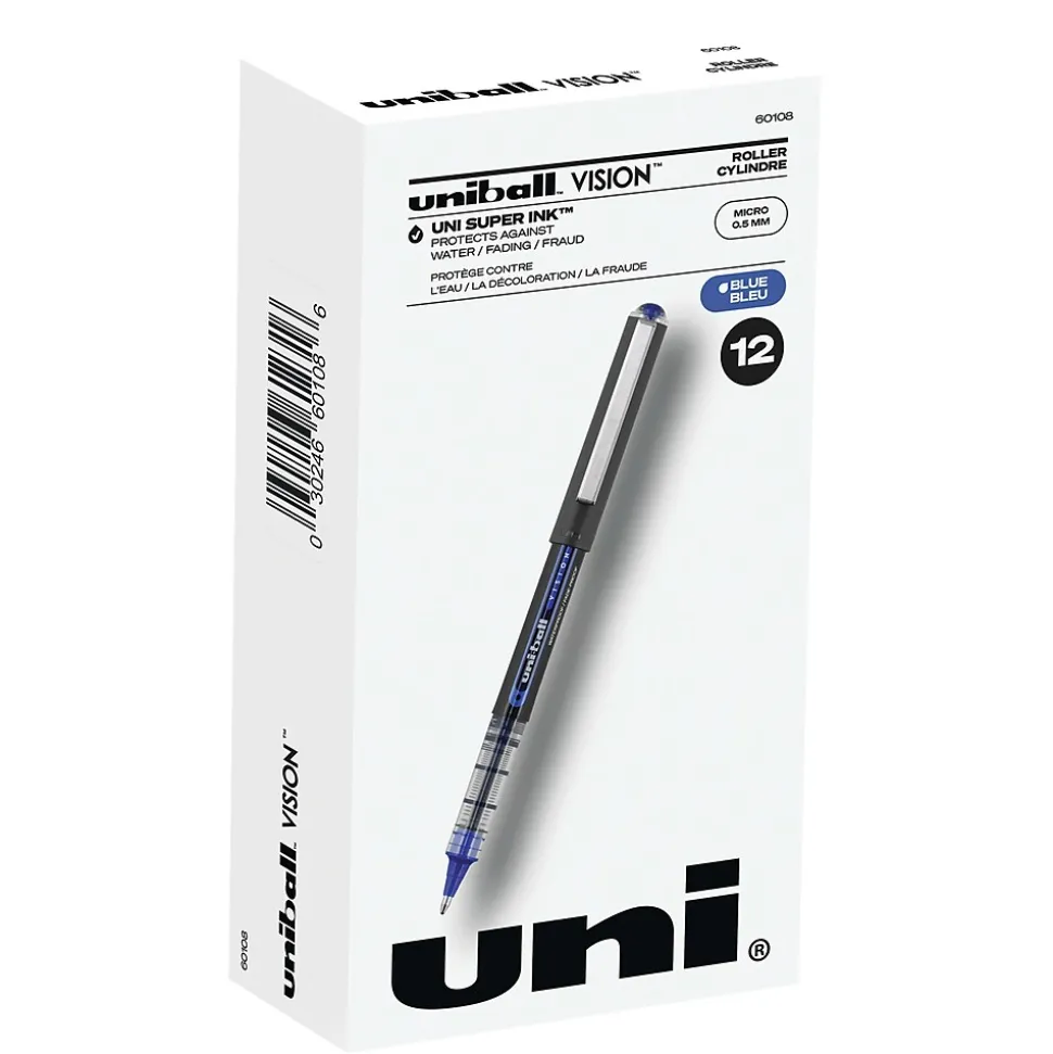 Make your everyday writing easy with the effortless and dependable performance of Vision Rollerball Pens from uniball available in multiple tip sizes. Capped roller pens deliver an even liquid ink lay-down for reliably smooth, vivid lines and a rich color for improved clarity and readability. Great for all writing tasks from taking notes to record keeping with archival quality, acid free roller ink. Innovative uni Super Ink technology forms an indestructible bond with the paper to minimize the risk of check washing or document fraud, while also protecting from water and fading. The exclusive Uni-Flow Ink System ensures a consistent, delightfully fluid writing experience, and a translucent window ensures that you don’t run out of ink unexpectedly. Enjoy beautiful clean lines and give all of your ideas a burst of brilliant color with this classic style rollerball pen.